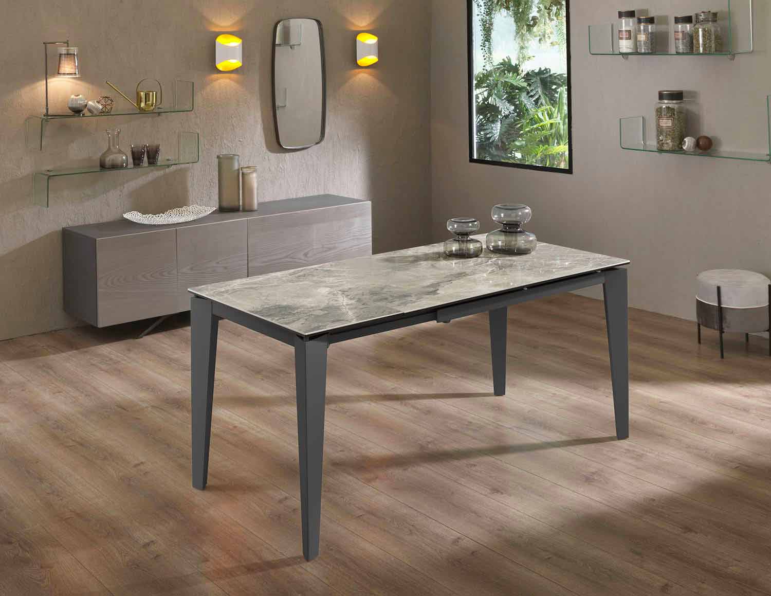 Syrta është një tryezë ngrënie drejtkëndëshe e karakterizuar nga mundësia e zgjatjes deri në 170 cm për të marrë, kur është e nevojshme, më shumë hapësirë në tryezë dhe për pasojë komoditet më të madh, ideale për të pritur miqtë dhe të afërmit pa dëmtuar rehatinë. Tabela është bërë me një strukturë metalike të pikturuar dhe majë qeramike në xham të zbutur me ngjyrë antracit që e bën tryezën elegante dhe rezistente në të njëjtën kohë dhe është gjithashtu e kompletuar me zgjatime të brendshme, gjithashtu qeramike në xham të bardhë.