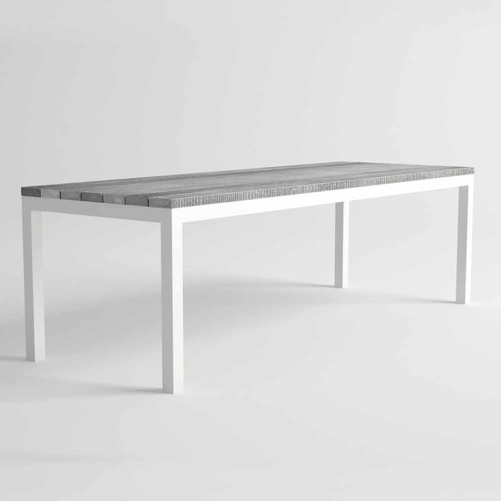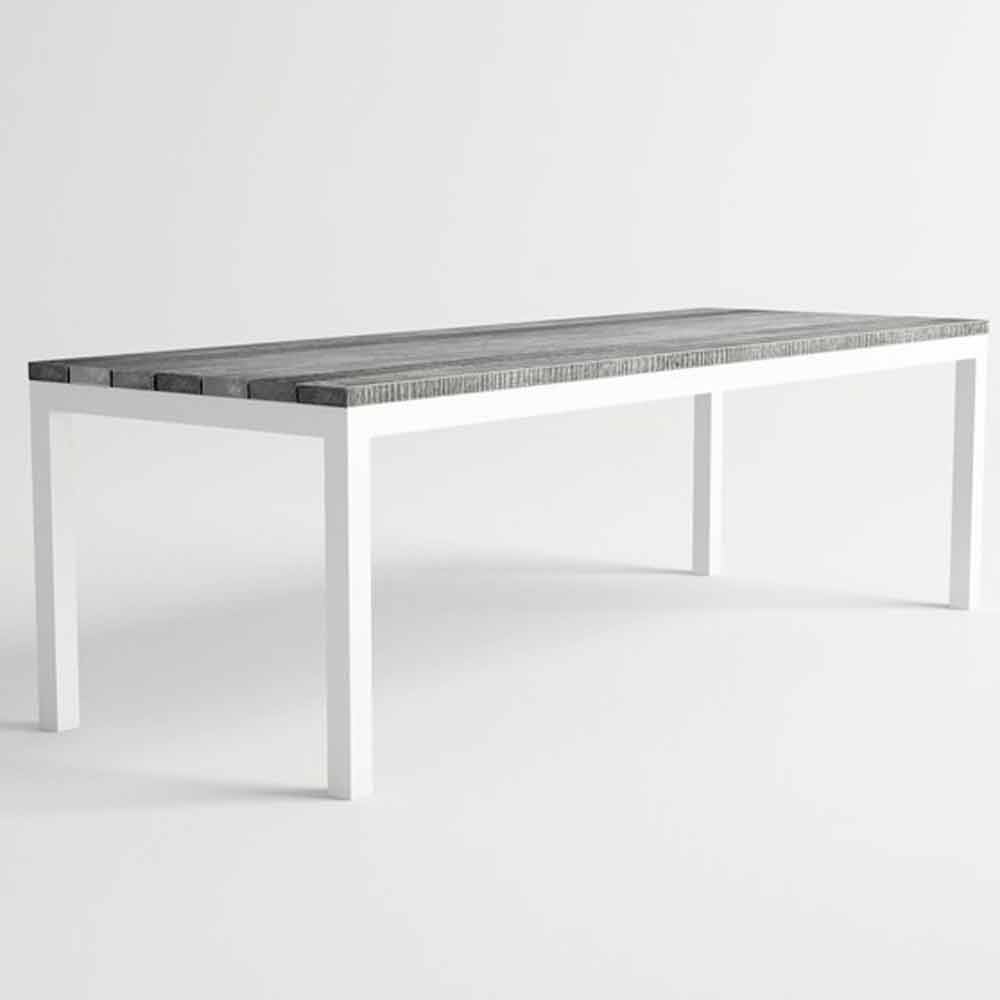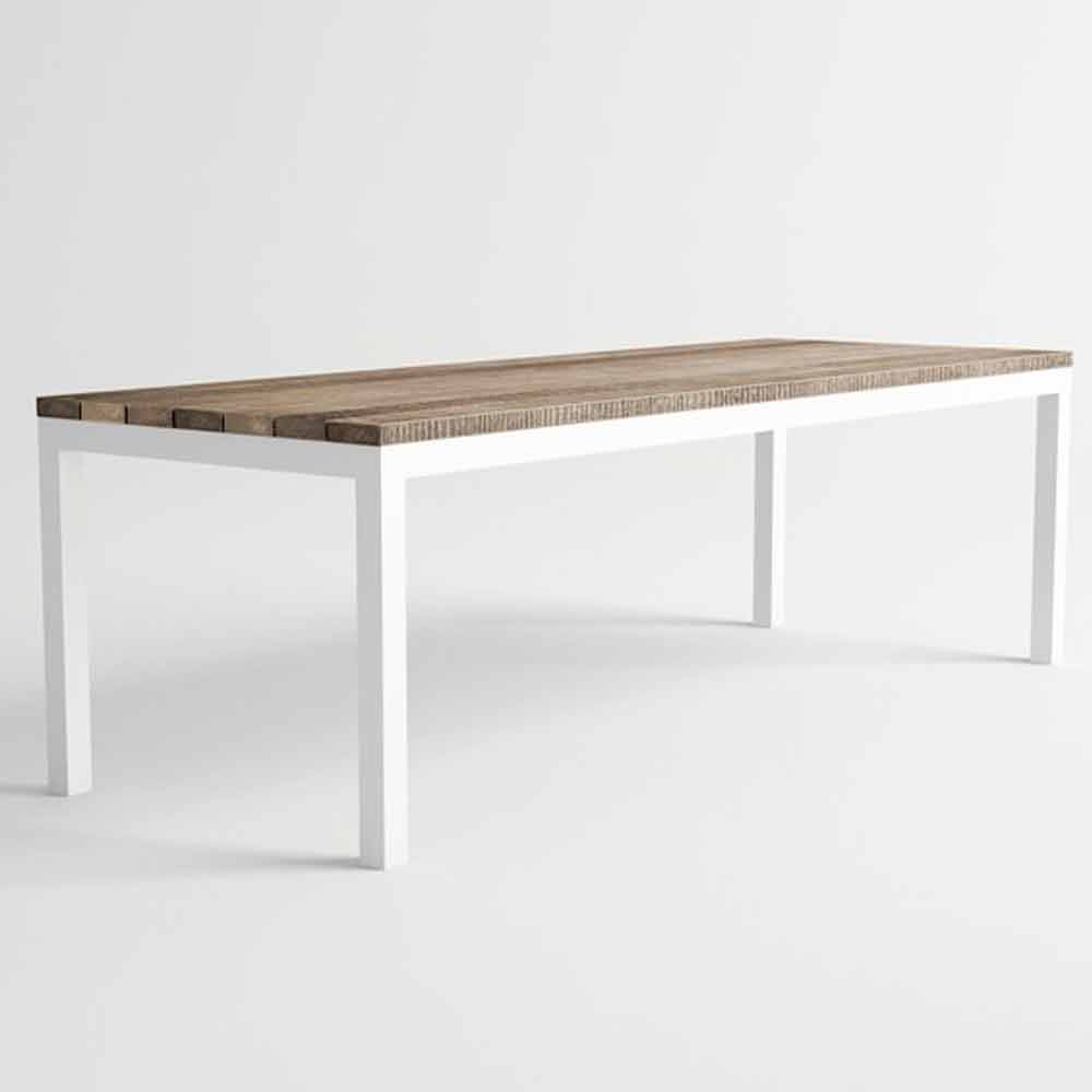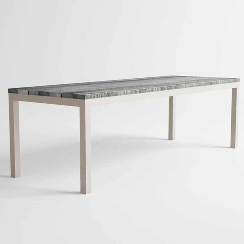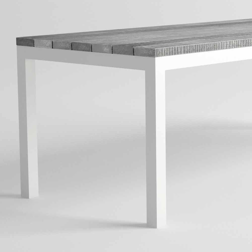 Tabela kopshtesh me dizajn modern, strukturë alumini dhe druri, të disponueshme në ngjyra të ndryshme.