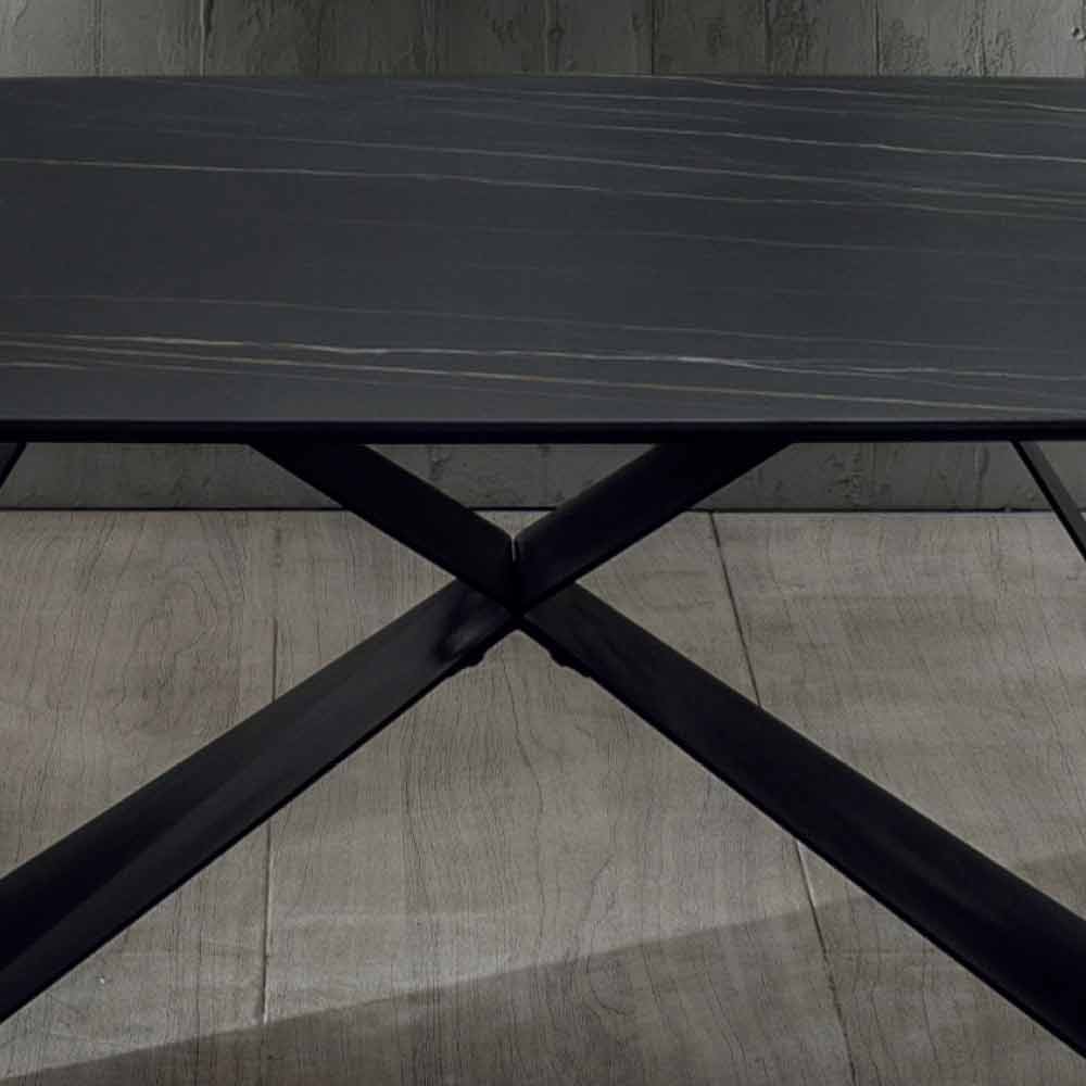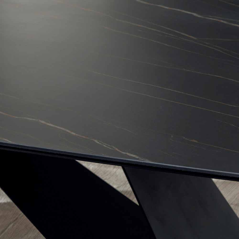 Kjo tryezë ngrënie është një produkt me një ndikim të fortë vizual, i aftë të pushtojë qendrën e skenës me shumë elegancë. Struktura e saj është bërë prej metali të pikturuar me antracit mat ndërsa pjesa e sipërme përbëhet nga një shtresë e sipërme qeramike e pastër me njëefekt portoro të trashë 6 mm nën të cilën aplikohet një shtresë qelqi me trashësi 8 mm e cila i jep fleksibilitet qeramikës duke lejuar kështu shmangien e dëmtimit . Për më tepër, në sajë të madhësisë së saj të madhe, tryeza mund të strehojë deri në 10 persona duke bërë kështu të mundur dreka dhe darka me miqtë. Ajo që e dallon këtë artikull është padyshim projekti i veçantë i bazës i cili, falë lojërave gjeometrike të krijuara nga pllakat metalike, i jep lëvizje dhe karakter tryezës. Kombinimi i materialeve dhe përfundimeve të zgjedhura lejon marrjen e një produkti përfundimtar me një dizajn jashtëzakonisht modern, ideal për mobilimin e dhomave me një shije të sofistikuar dhe elegante .