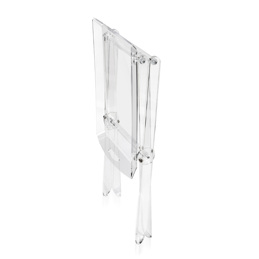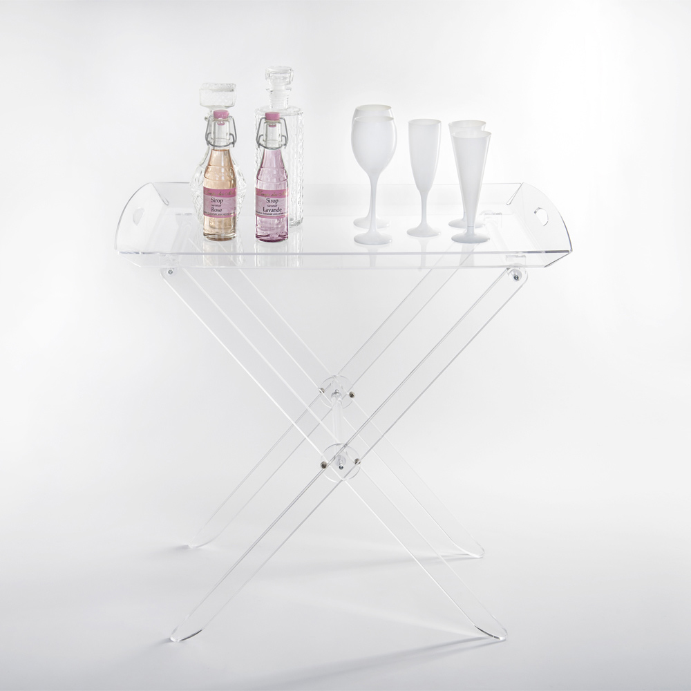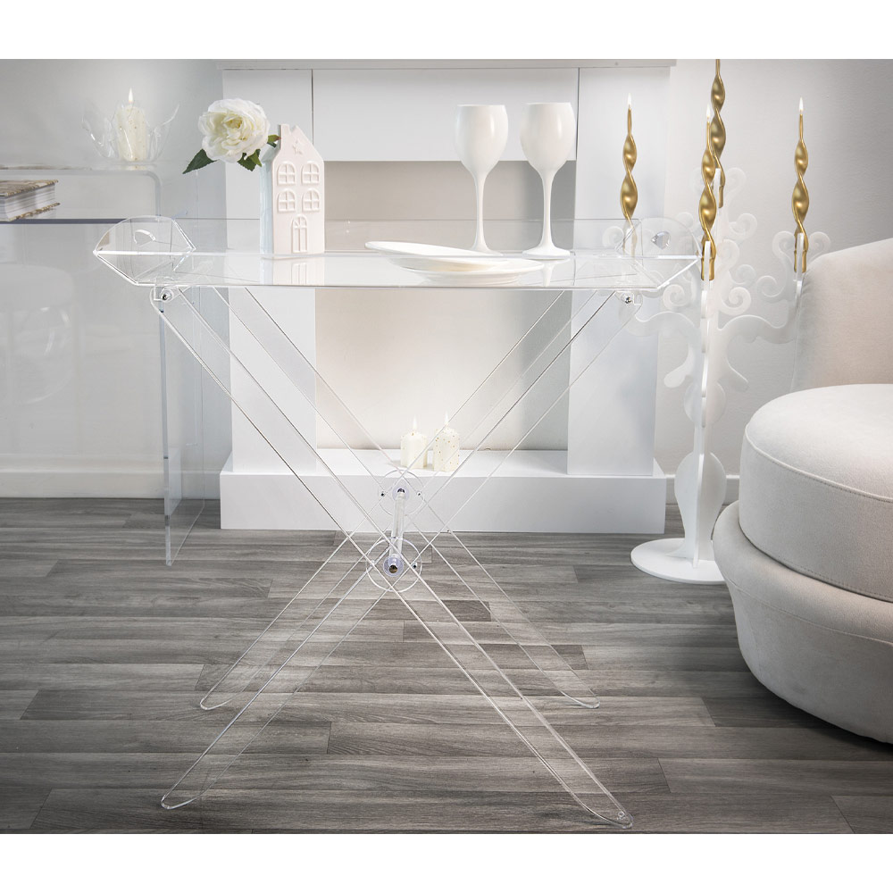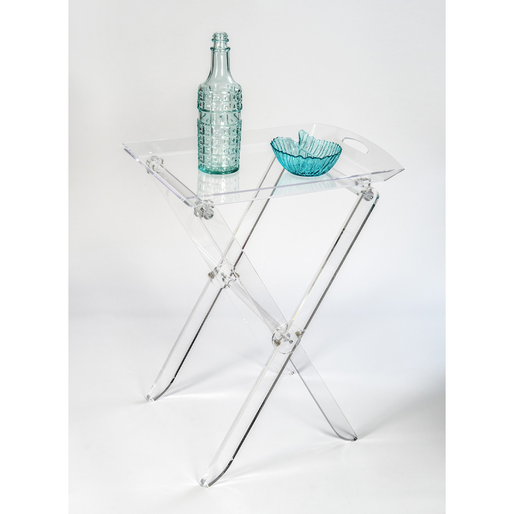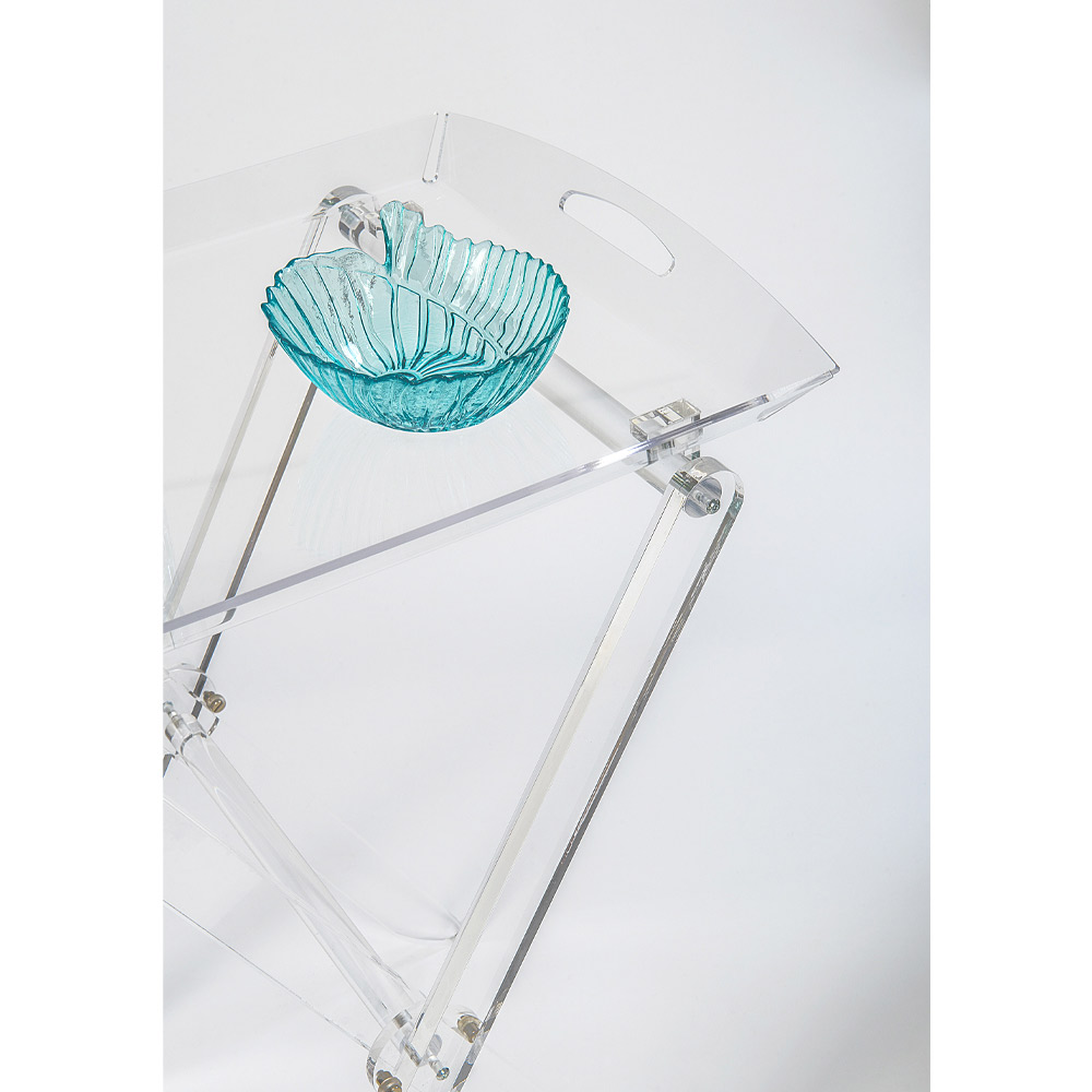 Kjo tryezë e palosshme e bërë nga kristali akrilik nga polimeri i virgjër karakterizohet nga dizajni i tij i gjithanshëm dhe praktik që mund të paloset për të minimizuar rrëmujën me një raft tabaka që mund të përdoret për mëngjes ose për të shërbyer kafe për mysafirët. Konceptuar, projektuar dhe prodhuar në Itali , me materiale italiane, shkëlqimi dhe shkëlqimi konstant dhe i pandryshuar me kalimin e kohës.