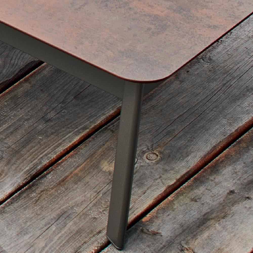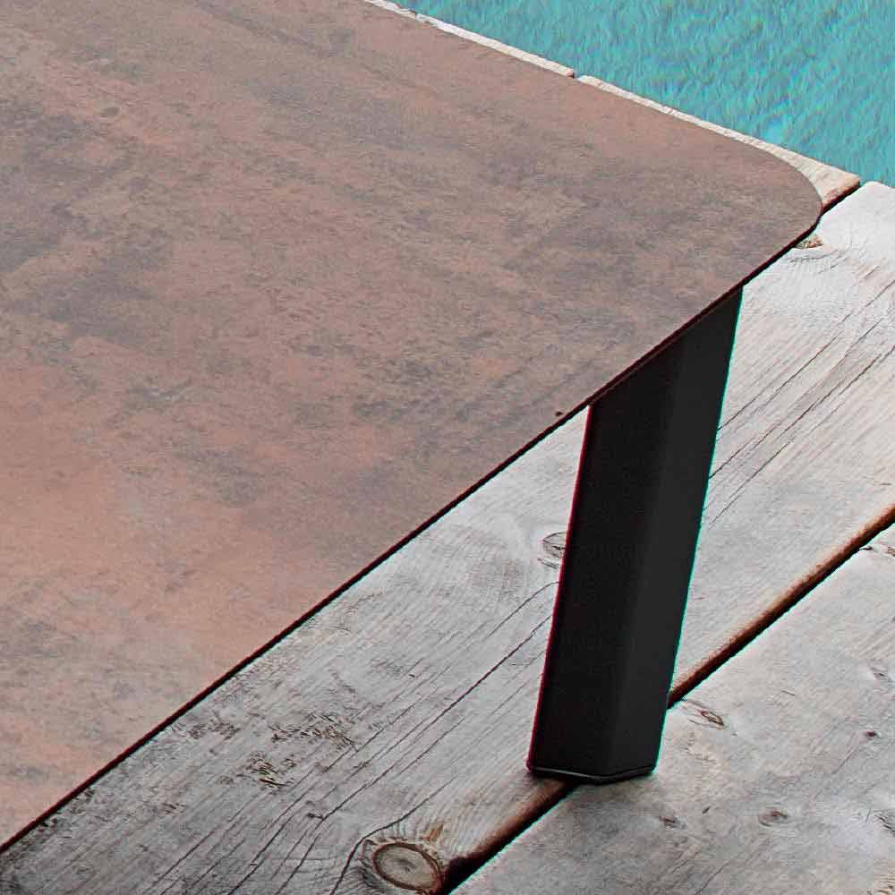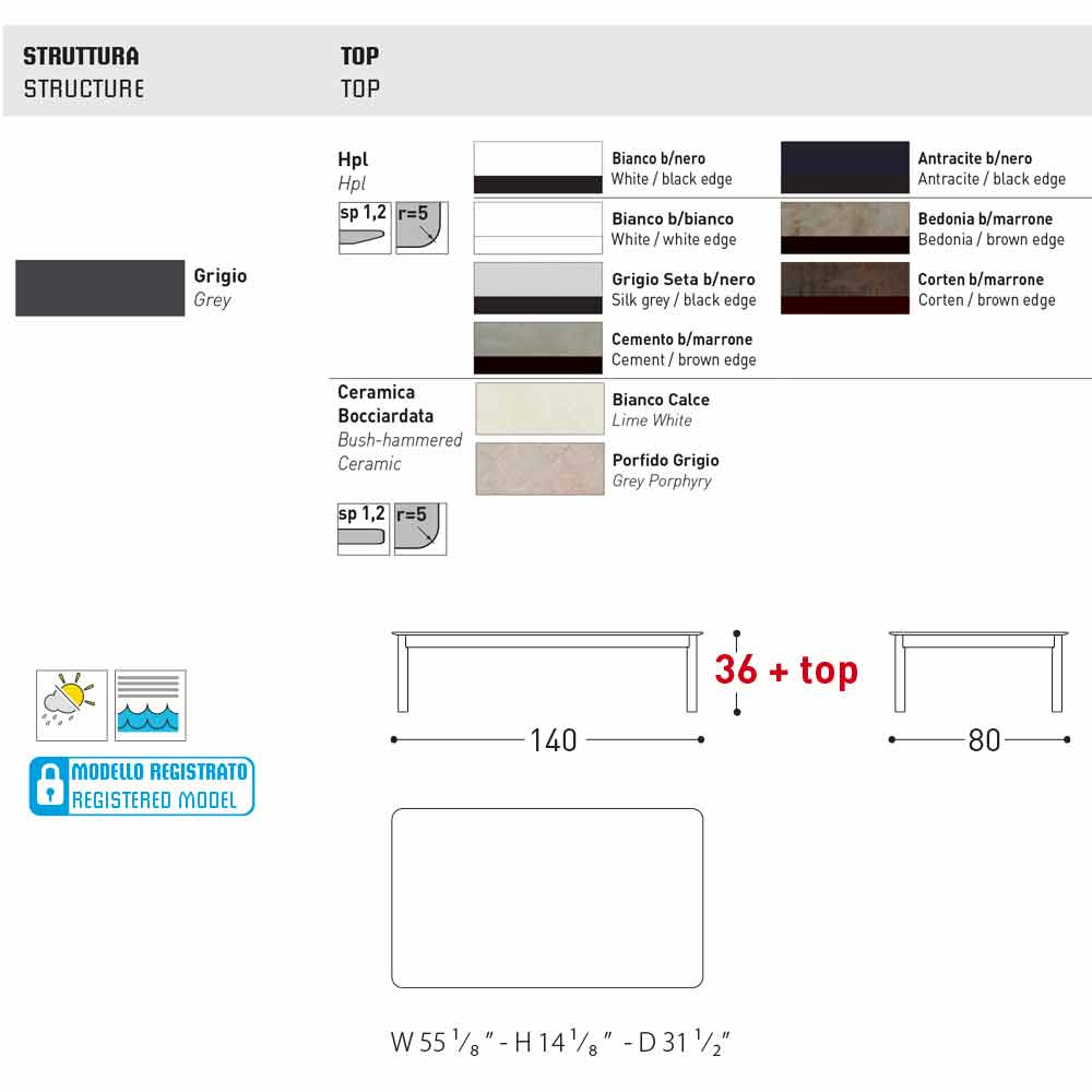 Sistemi është një tryezë kopshte elegante me një strukturë alumini të veshur me pluhur gri ; me majë në HPL (sp. 1.2) në përfundim: kufiri i zi mëndafshi gri, mëndafshi i bardhë, kufiri i zi i bardhë, kufiri i zi anthracit, kufiri i bardhë i bardhë, kufiri me kafe çimentoje, kufiri me kafe bedonia, kufiri kafe corten ; ose me një majë qeramike me shkurre të lartë (sp. 1.2) në fund: gëlqere të bardhë dhe porfiri gri .