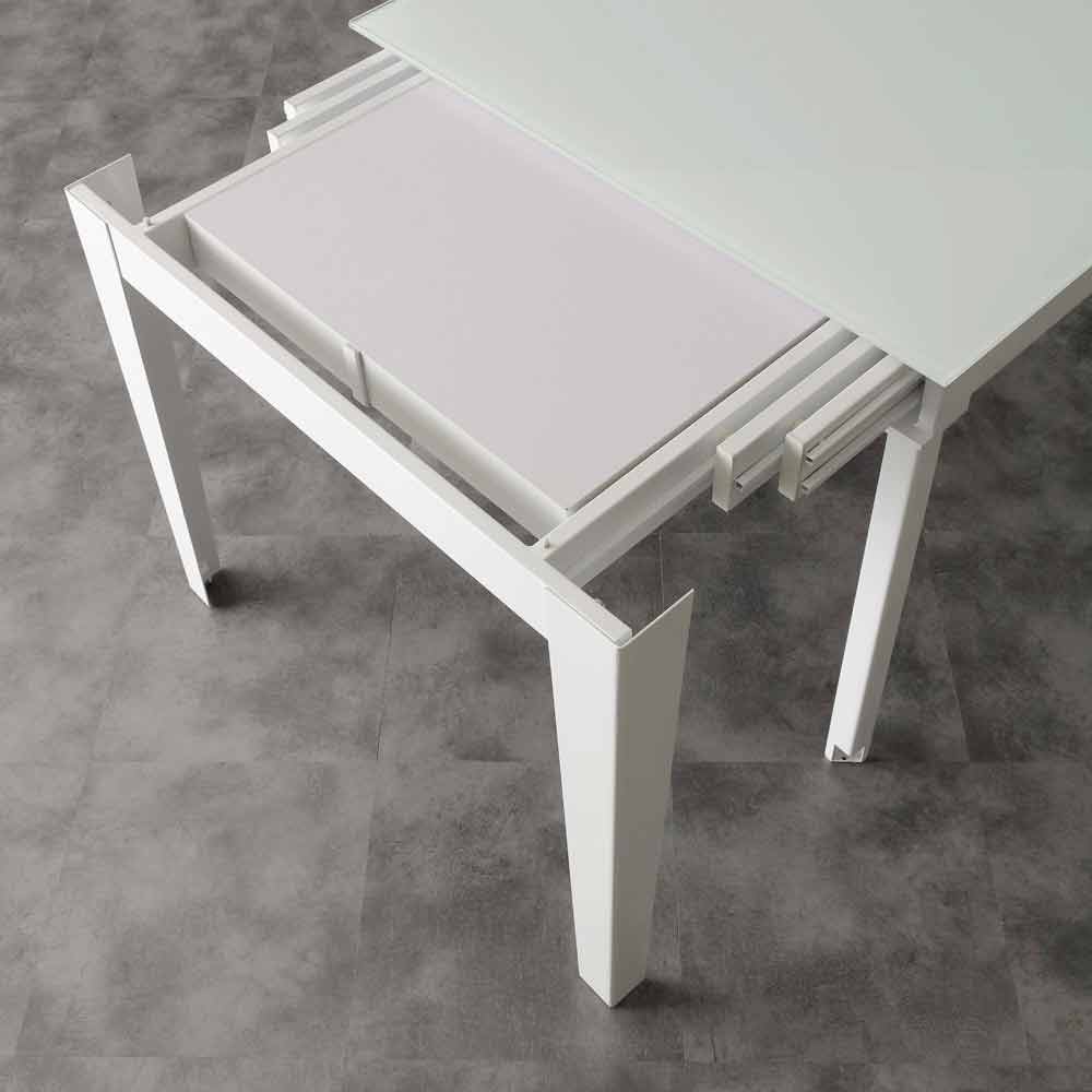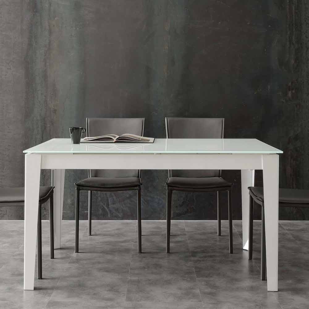 Tabela e shtrirjes Baltimora, me tavolinë qelqi të tundur, dizajn modern. Tavolinë moderne e ngrënies me xhama të tundur (10 mm). Kjo tabelë projektuesi është në dispozicion në dy kombinime të ndryshme ngjyrash: - dritë me shkëlqim pëllumb xhami të lartë gri dhe kornizë metalike gri pëllumb të lehta; - Kornizë me shkëlqim të lartë dhe të bardhë me xham me shkëlqim. Baltimora vjen me katër gjethe zgjatuese, të cilat mund të ruhen lehtësisht brenda majës së tryezës. Zgjatjet janë bërë nga paneli melamine dhe përputhen me majën e xhamit. Baltimora është tryeza e përsosur e qelqit për të arreduar dhomën tuaj të ngrënies me stil dhe elegancë.