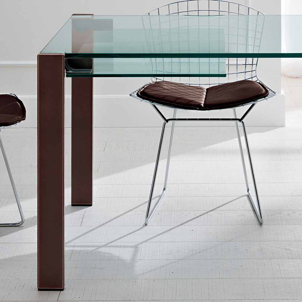 • majat dhe shtesat në xhami transparente, këmbët metalike të mbuluara me lëkurë kafe të errët;