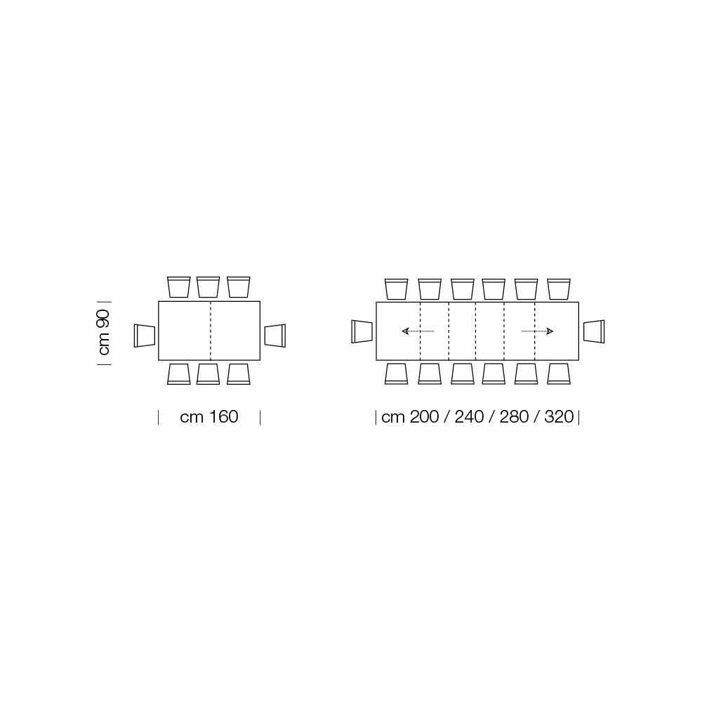 L 160 (320) x D 90 x H 77 cm me 14 vende të zgjatura me katër zgjatime të brendshme 40 cm;