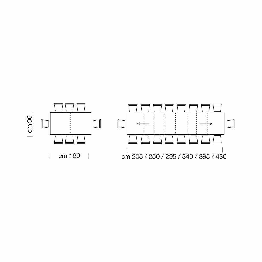 L 160 (430) x D 90 x H 77 cm 18-vendësh i zgjatur me gjashtë shtesa 45 cm, tre të brendshme dhe tre të furnizuara në një kuti kartoni të ripërdorshme;