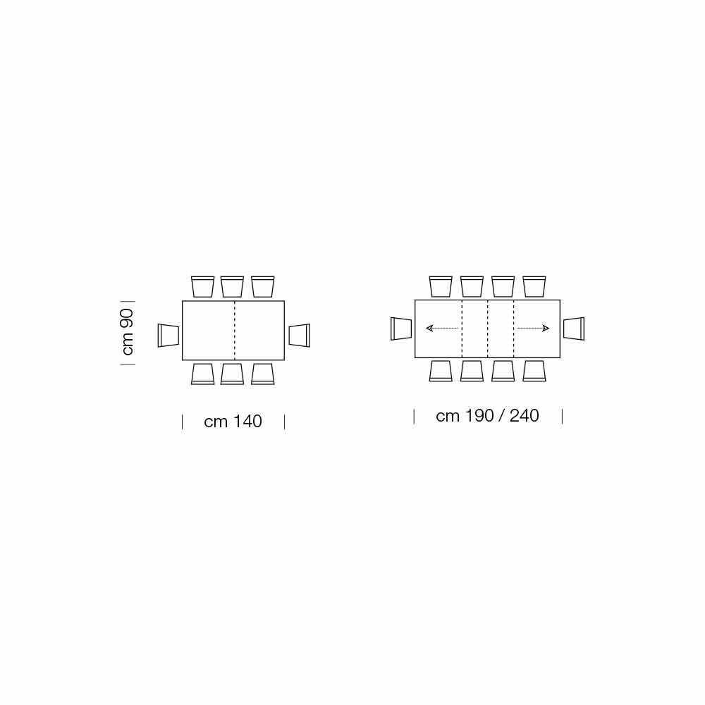 L 140 (240) x D 90 x H 77 cm 10 vende të zgjatura me dy zgjatime të brendshme prej 50 cm secila;
