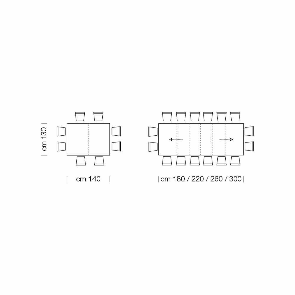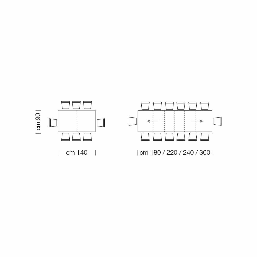 L 140 (300) x D 90 x H 77 cm me 14 vende të zgjatura me katër zgjatime të brendshme 40 cm;
