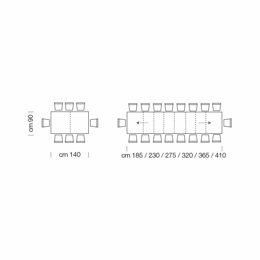L 140 (410) x D 90 x H 77 cm 18-vendësh i zgjatur me gjashtë shtesa 45 cm, tre të brendshme dhe tre të furnizuara në një kuti kartoni të ripërdorshme;