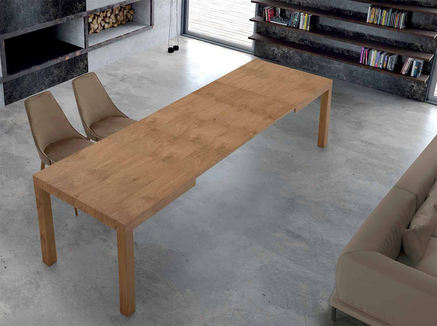 Tavolinë ngrënieje e zgjatur deri në 470 cm, e punuar me dorë në Itali me rimeso lisi me nyje.