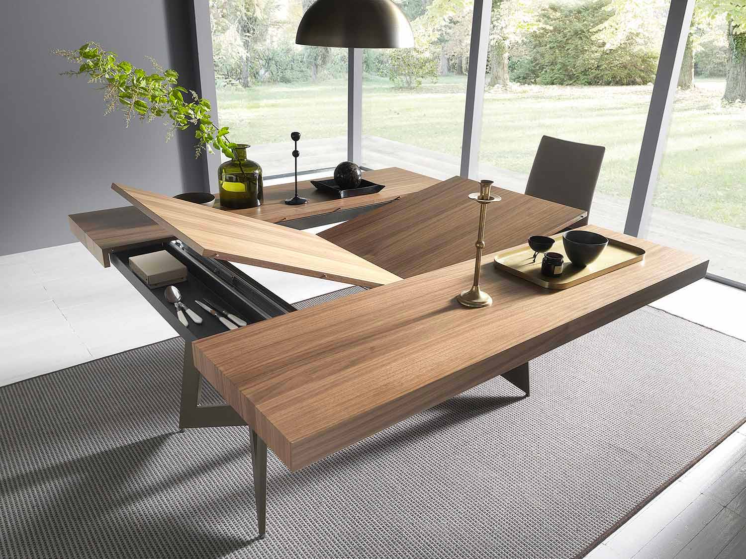 Karakteristika e tij e veçantë konsiston në mënyrën se si zgjerohet nga një tavolinë drejtkëndëshe në një katror për të akomoduar nga 4 deri në 8 persona.