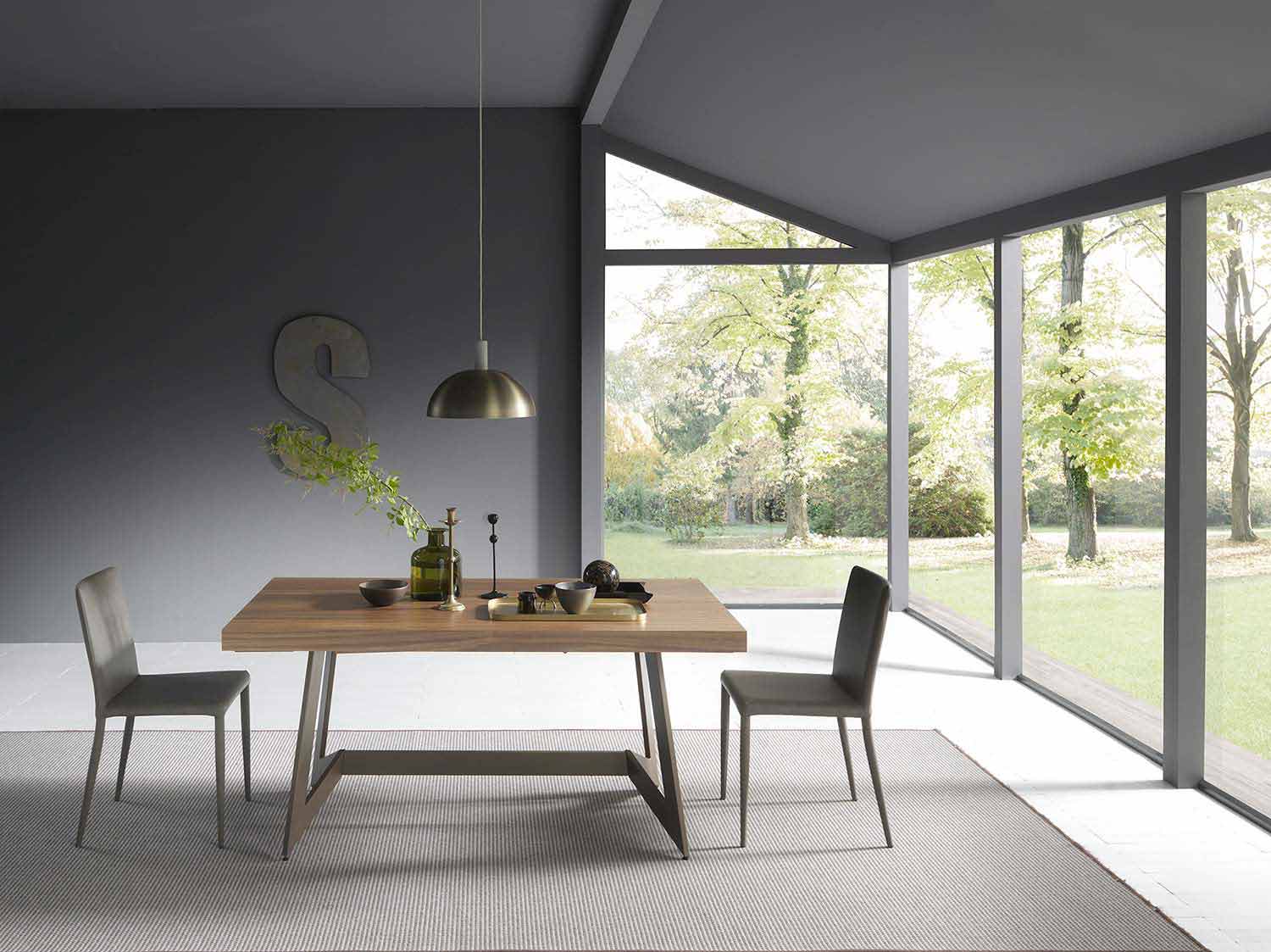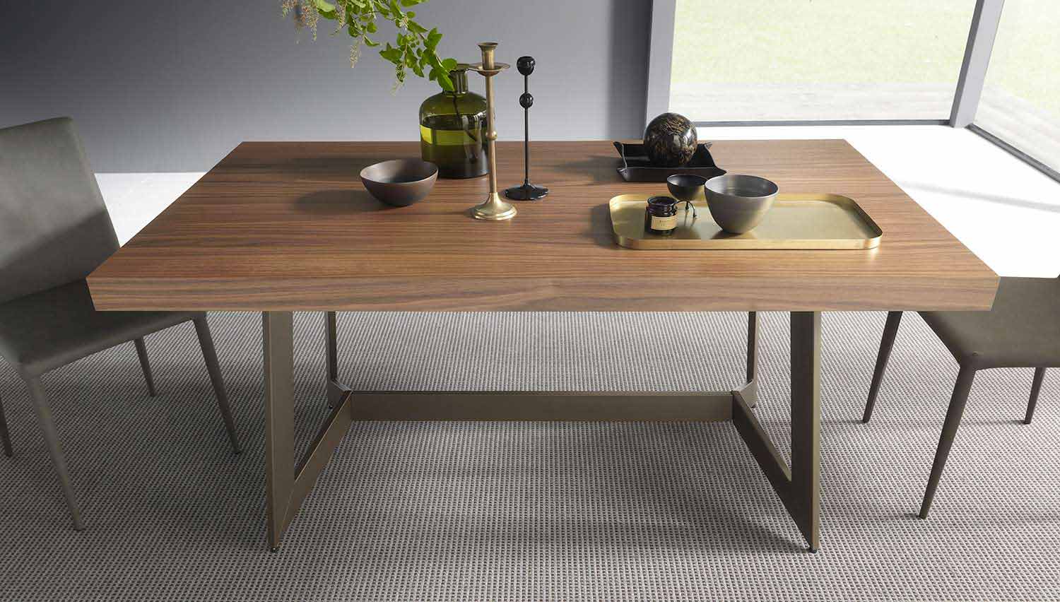 tavolinë e zgjatur ka një dizajn të butë dhe natyralist, me linja gjeometrike dhe elegante.