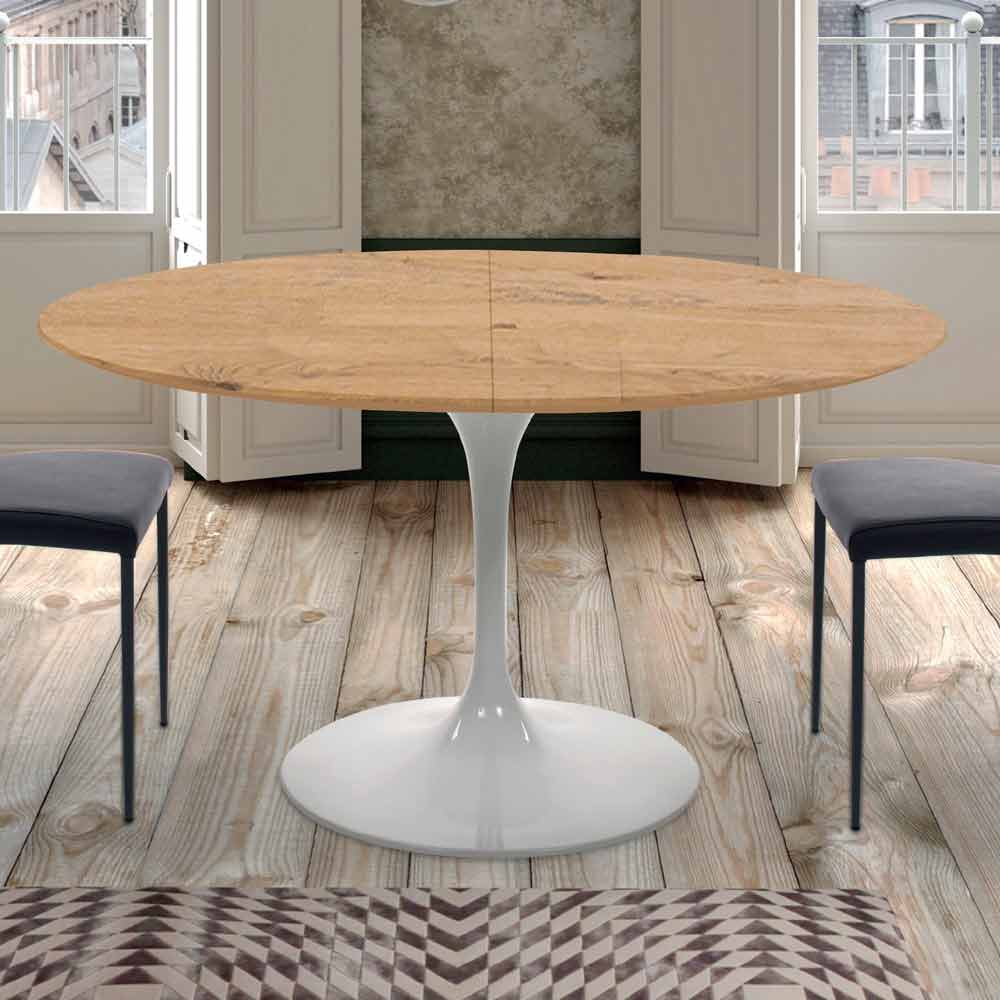 Tavolinë ngrënie e prodhuar në Itali me majë të rrumbullakët të zgjatur në dru të rimeso dhe bazë prej alumini të derdhur me llak të bardhë me shkëlqim. Eleganca e përjetshme e drurit dhe kokrrave të tij të mrekullueshme shkrihen me estetikën moderne dhe ekskluzive të metalit të llakuar për t'i dhënë jetë një rezultati revolucionar të aftë për të karakterizuar çdo hapësirë në shtëpi, duke sjellë me vete të gjithë personalitetin e saj të fortë bashkëkohor . Tavolina ka edhe një anë të fortë funksionale, element ky që jep pjesa e sipërme e zgjatur e cila, falë zgjatimit të jashtëm 50 cm , arrin një gjatësi prej 170 cm duke ofruar mundësinë e pritjes deri në 8 persona dhe organizimit të drekave dhe darkave të mrekullueshme në shoqëri.