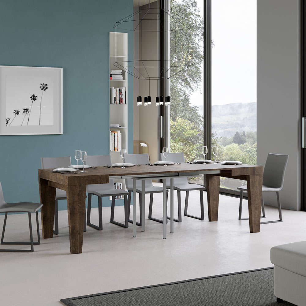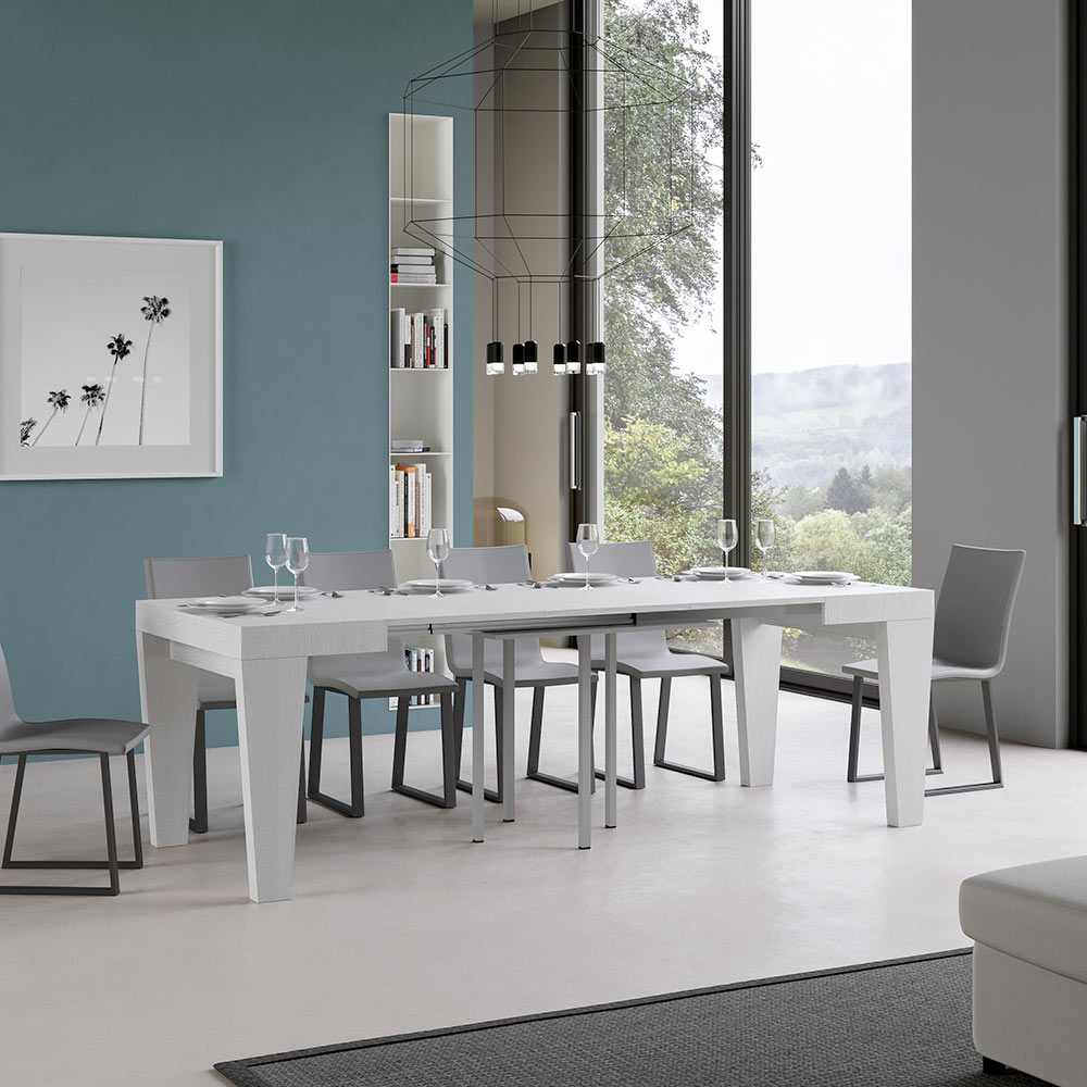 Tavolinë ngrënieje e zgjatur e bërë nga mikrogrimca druri, tërësisht Prodhuar në Itali. Zgjatjet mund të futen në mënyrë progresive, duke lejuar konfigurime me gjatësi të ndërmjetme, kështu që ju mund të zgjidhni nëse do ta përdorni me një, dy ose tre shtesa bazuar në nevojat tuaja të hapësirës. Kur nuk përdoren, shtesat duhet të ruhen diku tjetër dhe nuk mund të vendosen brenda strukturës së tabelës. E pajisur me një sistem qendror mbështetës praktik me 4 mbështetëse tokësore, i cili lejon që tavolina të mbetet e qëndrueshme dhe e besueshme edhe kur hapet në shtrirje maksimale.