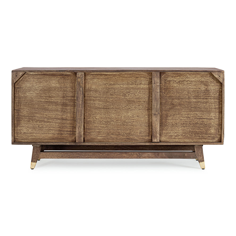 Ky bufe me dizajn për dhomën e ndenjes ka një strukturë prejdruri mango dhe mbështetëse MDF me doreza çeliku.