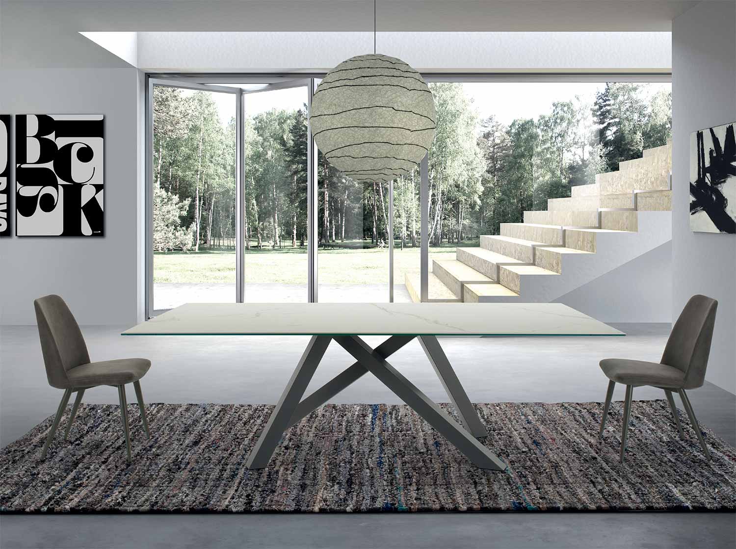 Tavolinë me majë qeramike dhe bazament çeliku gri pëllumb të dizajnit modern të prodhuar në Itali.