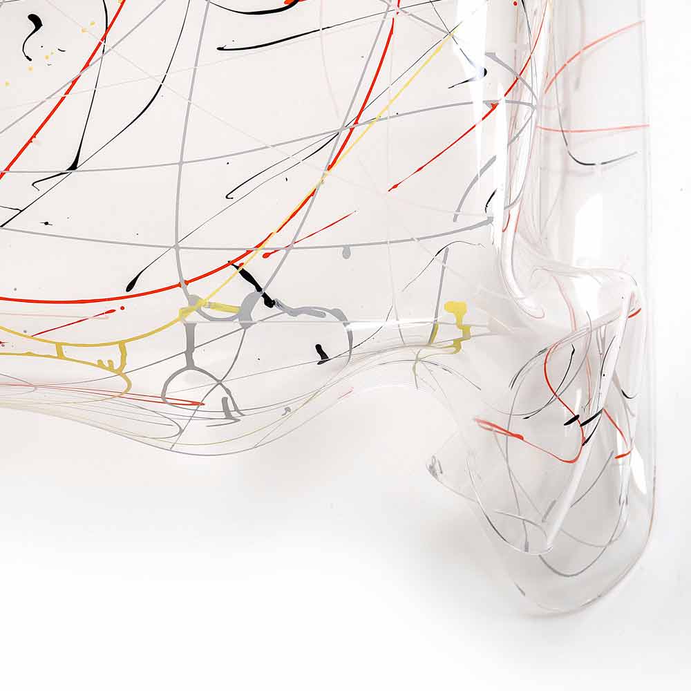 Dizajni tavolinë kafeje pleksiglase e bërë në Itali, Azi Tabledo tryezë e shtruar në Azi është një pjesë unike, një vepër e artit modern. Një fletë e polimerit të pastër të virgjër 100% të pleksiglasë PMMA me zanat për bojëra llak; draplohet me dorë në temperatura të larta, për të krijuar një tabelë unike dhe të papërsëritshme. Struktura e ndërtuar është plotësisht vetë-mbështetëse.