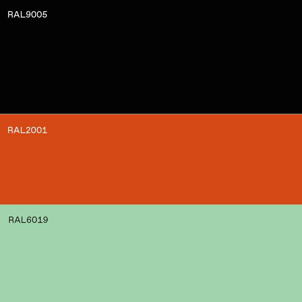 Mbarimi: këmbët në ngjyrë portokalli RAL2001 + kryq i gjelbër aqua RAL6019 + majë rezistente ndaj gërvishtjeve në të zezë RAL9005