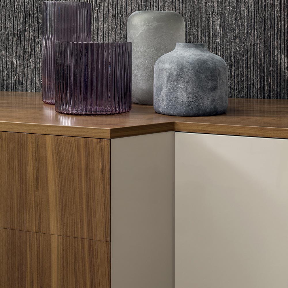 Ky bufe për dhomën e ndenjes ka një strukturë të bërë tërësisht me MDF të llakuar në fundin dhe pjesën e sipërme të rërës dhe 2 sirtarë në dru të rimesuar në fundin e arrës Canaletto. Veçantia e aksesorit te arredimit jepet nga forma e rafinuar e cila rrit elementin qendror te spikatur , ndersa 2 dyert dhe anet reflektojne driten per shkak te tyre.prirje të ndryshme. Raftet e brendshme ne xham transparent te temperuar .