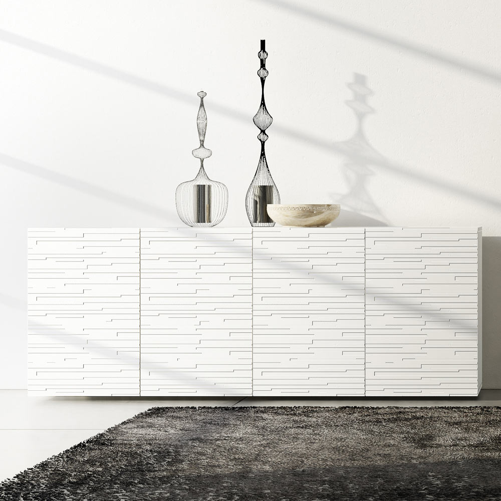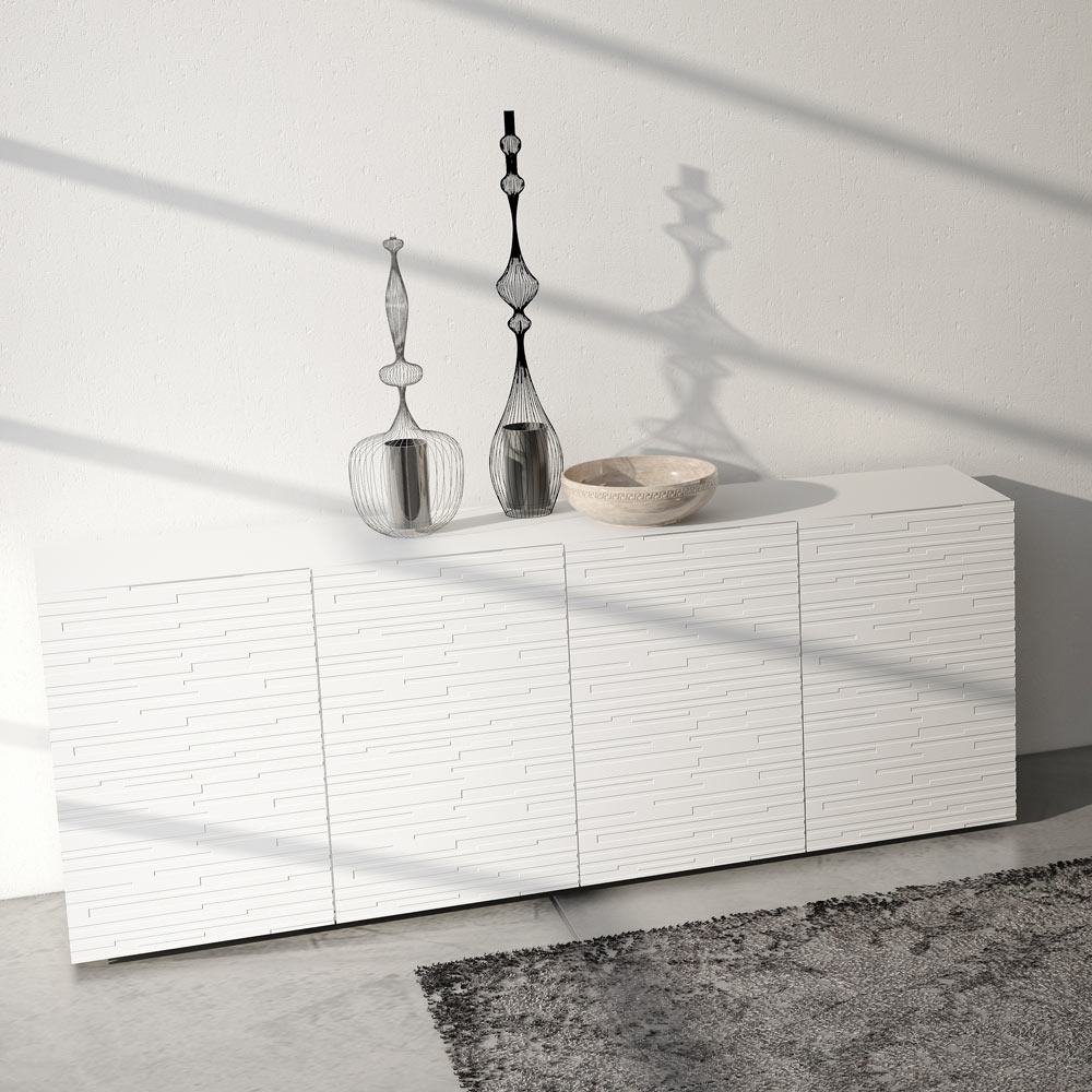Bofoni i dhomës së ndenjes me strukturë MDFme llak mat dhe me sistem hapjeje me 4 dyer me llak të bardhë mat me dekorim basoreliev. Ky produkt karakterizohet nga funksionaliteti dhe dizajni falë përfundimeve të tij elegante dhe të rafinuara dhe materialeve të ndryshme të përdorura për ndërtimin e tij, të cilat ofrojnë cilësi dhe rezistencë të madhe me kalimin e kohës , duke i dhënë produktit atë prekje unike dhe të paharrueshme.