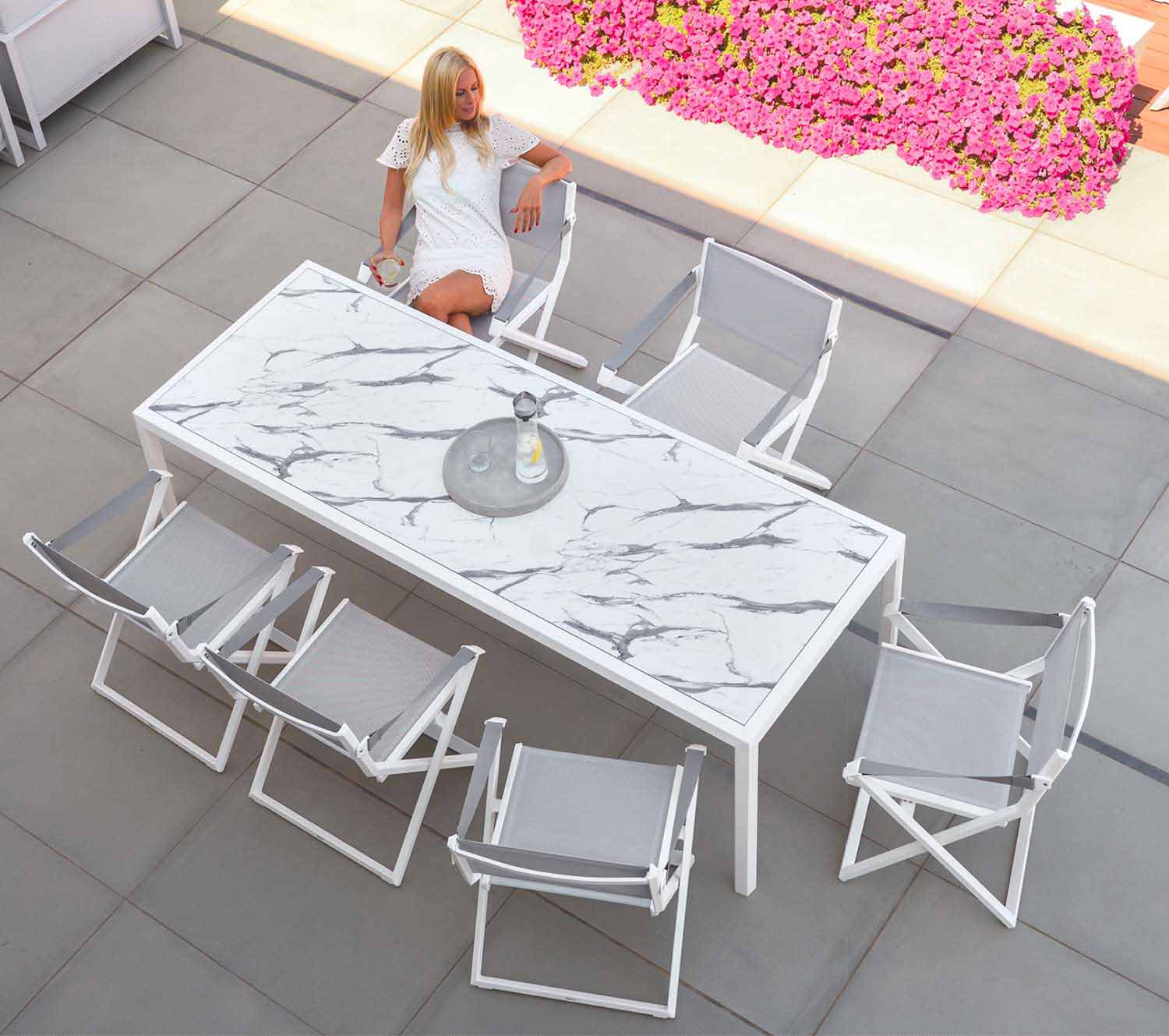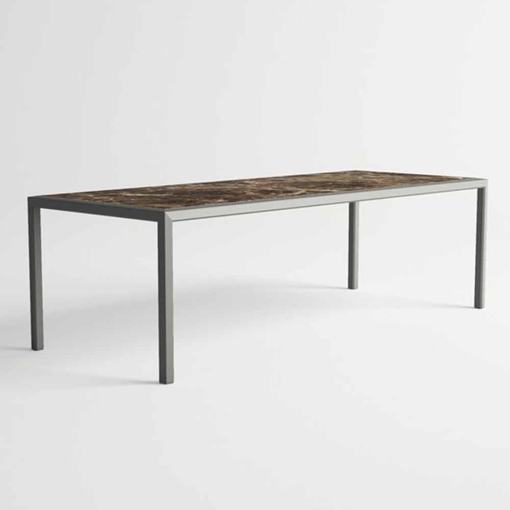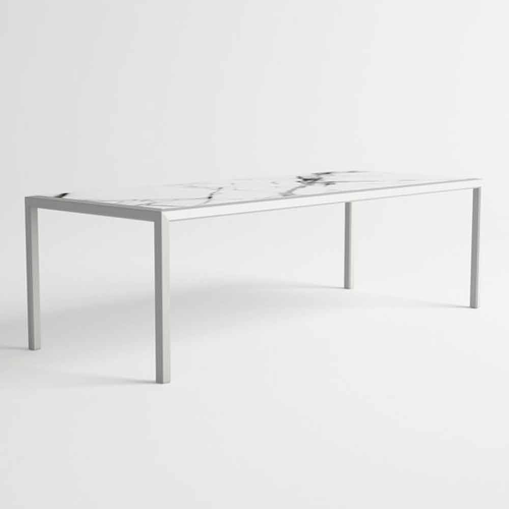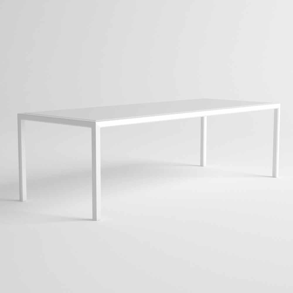 Tavolina e ngrënies ka linja tëthjeshta dhe thelbësore, me një strukturë alumini dhe pjesën e sipërme të petëzuar HPL, një material dekorativ i përbërë nga shtresa të shumta të letrës Kraft të ngopura me rrëshirë termosetting dhe të kompaktësuar me letër dekorative dhe veshje mbrojtëse përmes veprimit të kombinuar të nxehtësisë dhe presionit të lartë . Këto dy materiale janë të shkëlqyera në ato që zgjasin me kalimin e kohës, janë të lehta për tu mirëmbajtur dhe gjithanshëm.