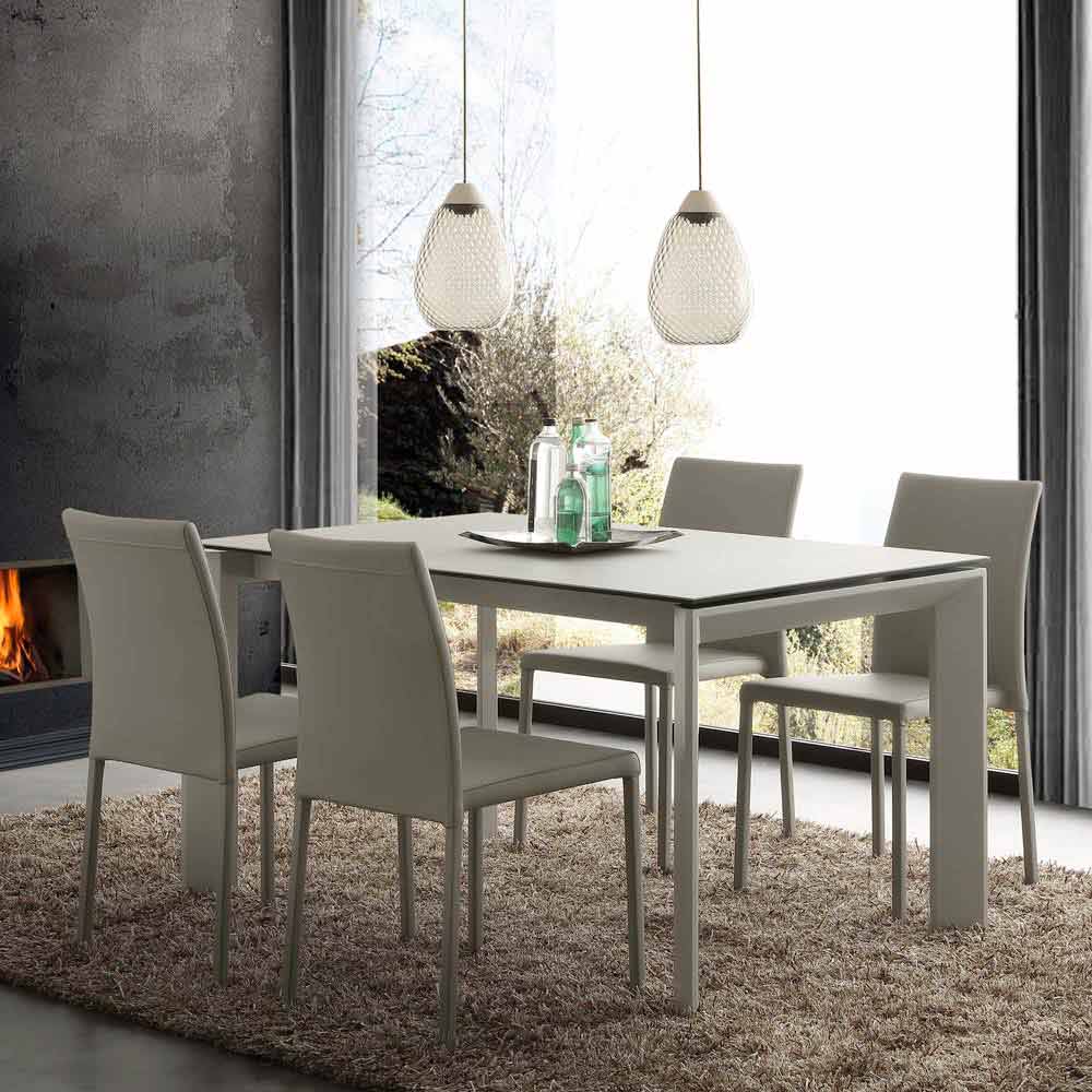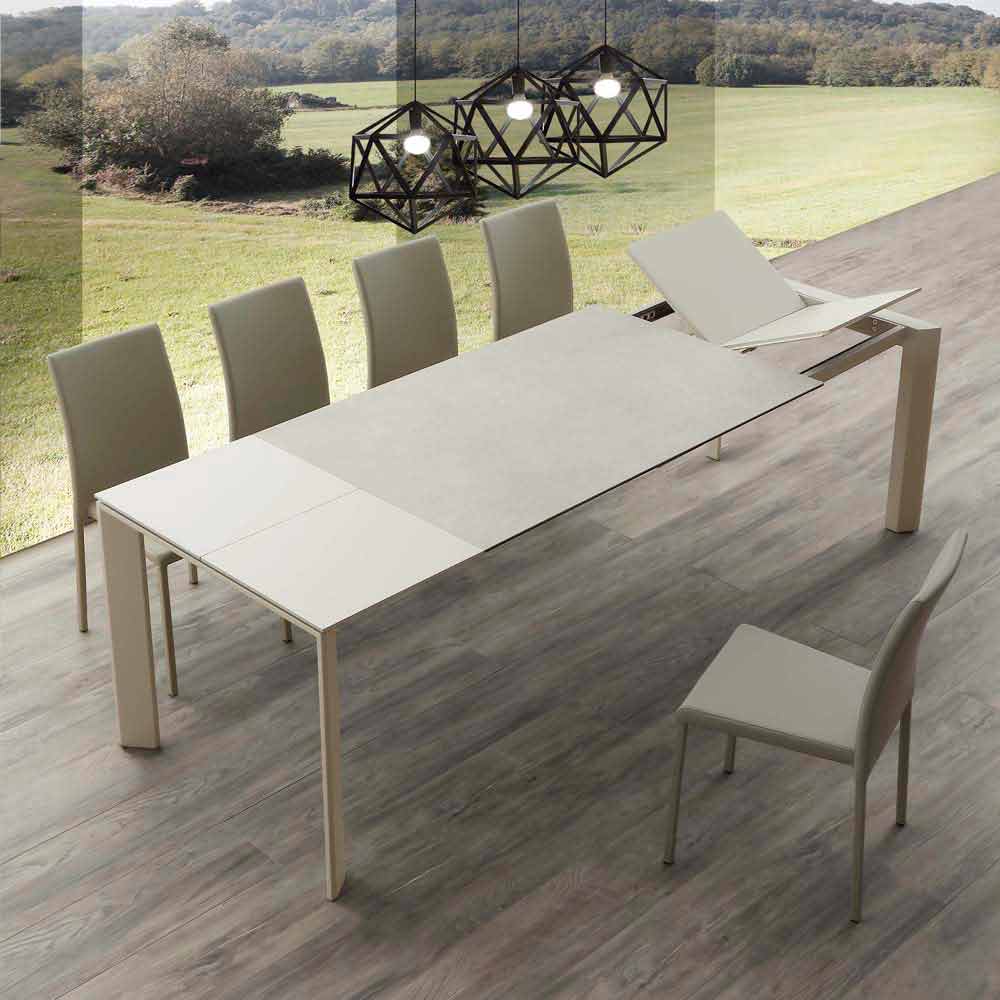 Karakteristikat e veçanta të kësaj tabele janë dy zgjatimet e pavarura të portofolit në dru melamine të stampuar me llak në të njëjtën ngjyrë që ju lejojnë të zgjeroni hapësirat deri në L190 cm dhe L240 cm, për një maksimum prej dhjetë vendesh. Zgjatimet vendosen brenda strukturës së tryezës.