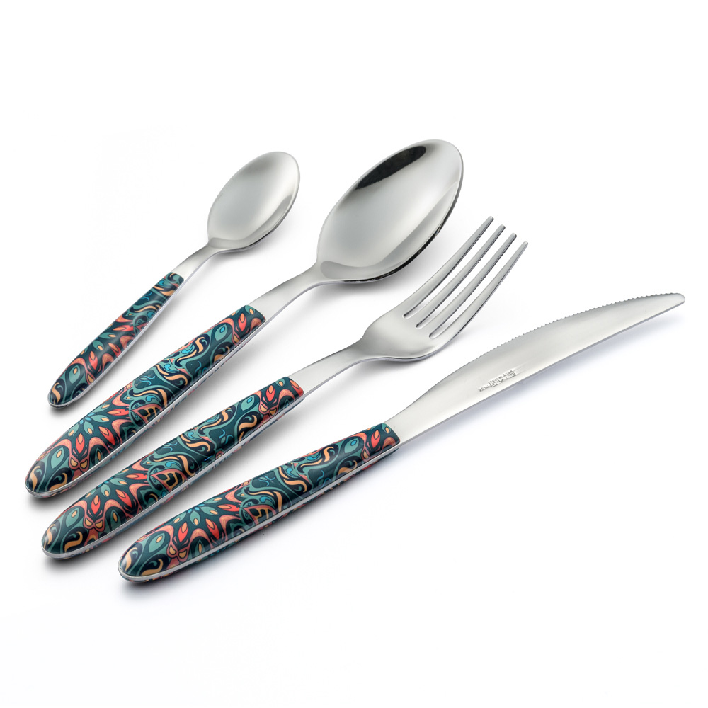 Komplet takëm inox dhe dorezë plastike me ngjyra me dekorim me lule, 24 copë prodhim Itali.