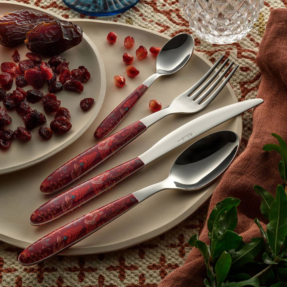 Komplet takëm prej inoksi dhe dorezë prej plastmasi ngjyrë guilloche, 24 copë prodhim Itali.