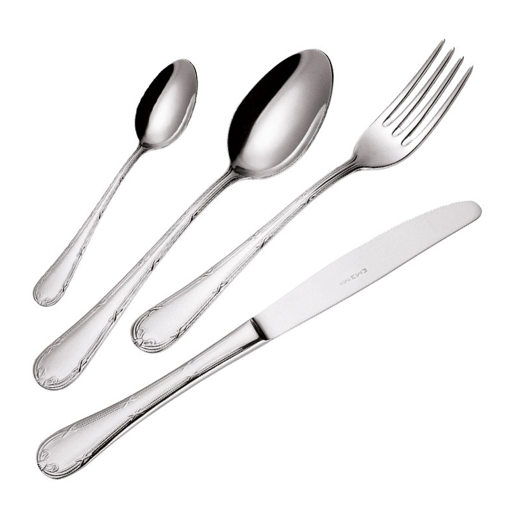 Komplet takëmesh në çelik inox të lëmuar, dizajn klasik me dekorime, 24 copë prodhim Itali.