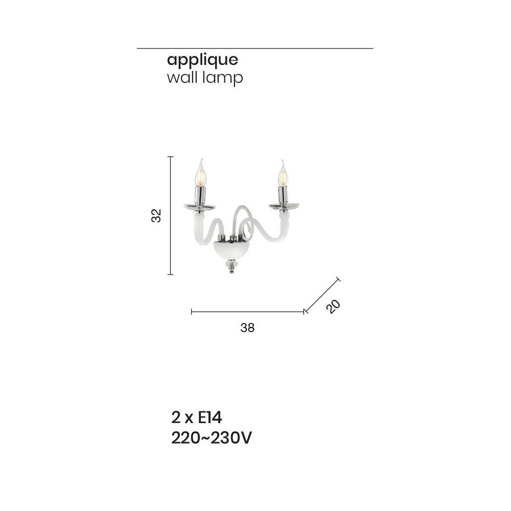 Kjo llambë muri me 2 dritë ka një dizajn klasik me një kallëp të rafinuar dhe elegant të përbërë nga krahë të harkuar prej xhami të punuar me dorë, ku mbështeten disqet në kristal të çmuar të prerë optik.