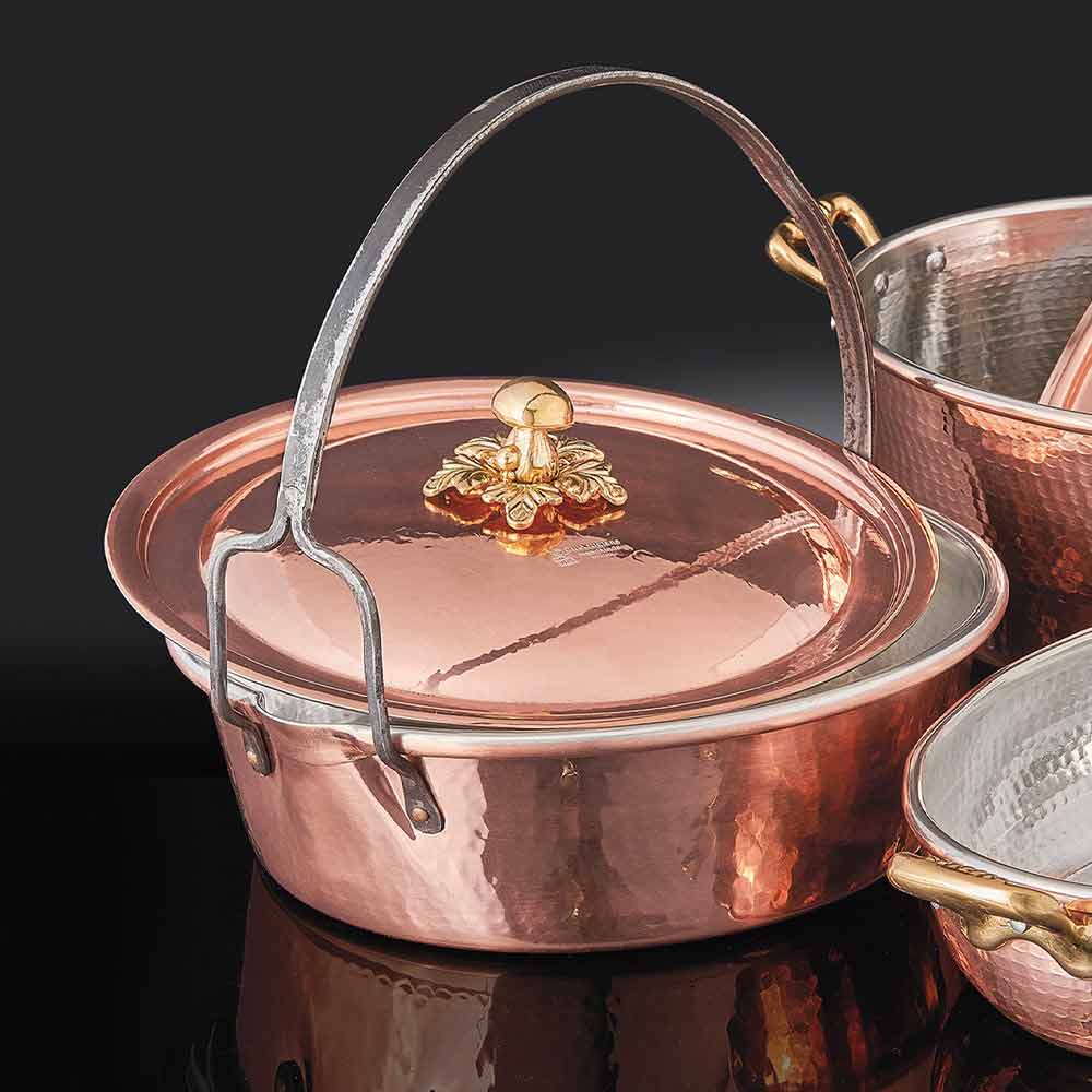 Tavë e rrumbullakët bakri me kapak dhe dorezë të harkuar, prodhim artizanal italian.