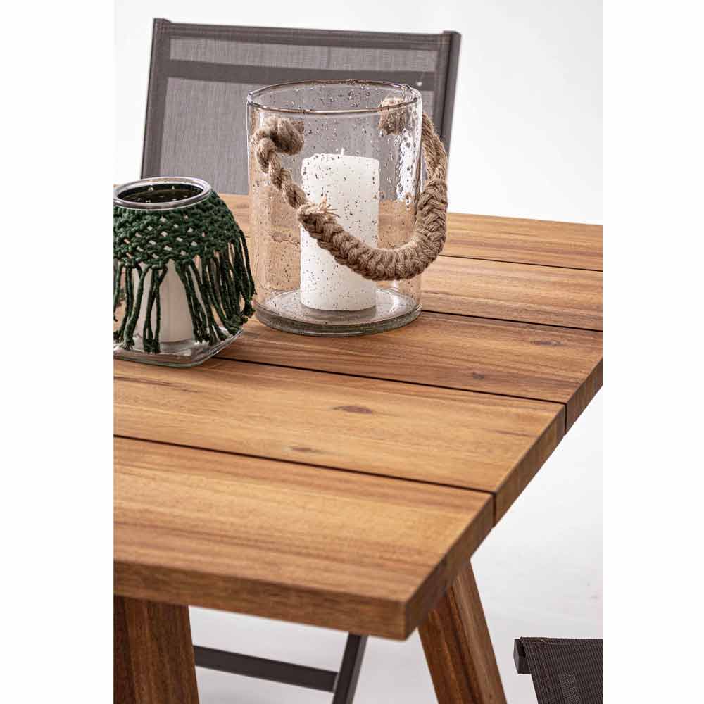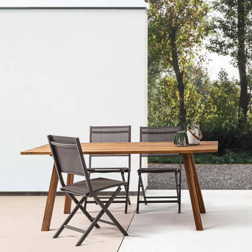 Struktura në dru akacie 100%. përfundimi i vajit. Vida çeliku të galvanizuar. Pllaka anësore në seksionet origjinale të bagazhit. Këmbët për tu mbledhur.