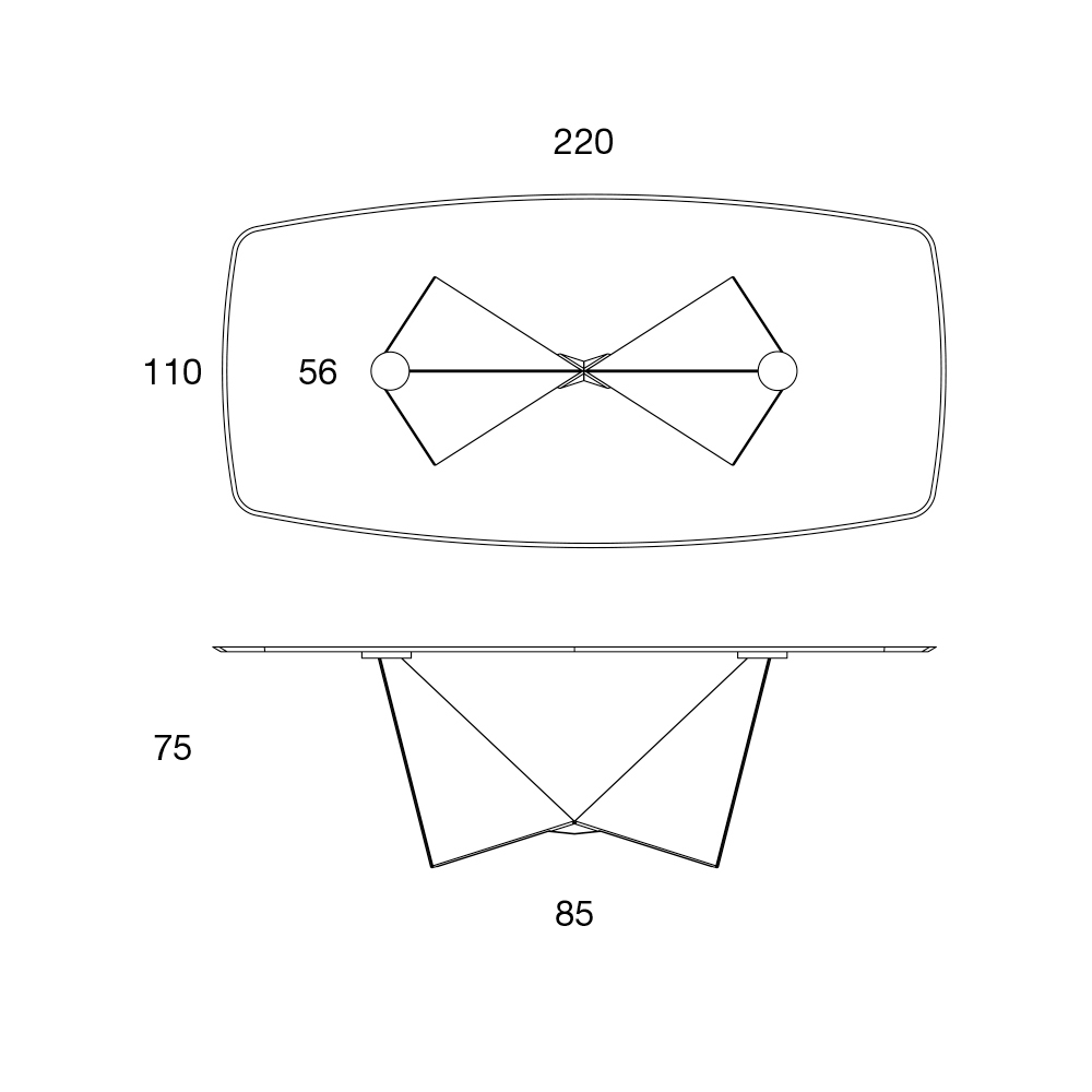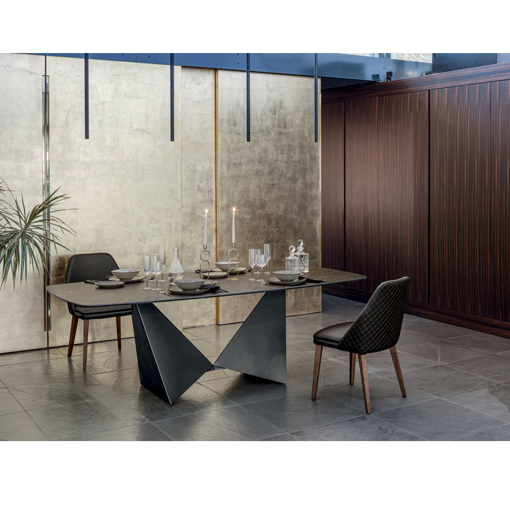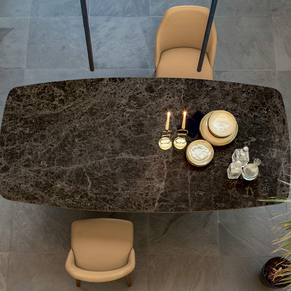 Kjo tavolinë ngrënie përmban një bazë metalike të veshur me pluhur dhe një majënë formë fuçie në qeramikë të errët mbi xhami. Dizajni me linja të buta dhe të lakuara mbështetet nga baza metalike me skajet e saj perfekte dhe vendimtare. Rezultati është një ekuilibër i lehtë që i jep një elegancë të madhe mjedisit.