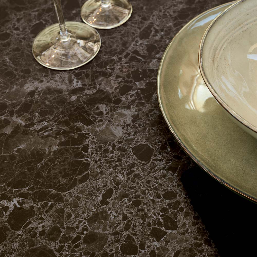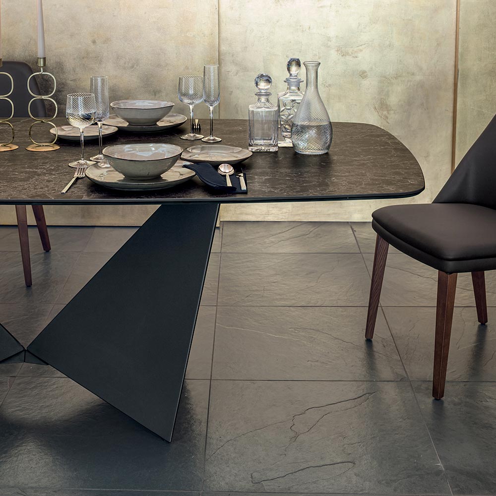 Tavolinë ngrënie me bazë metalike dhe majë qeramike mat në dekorime të ndryshme prodhimi në Itali.