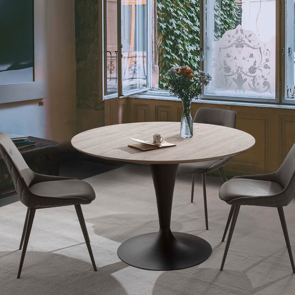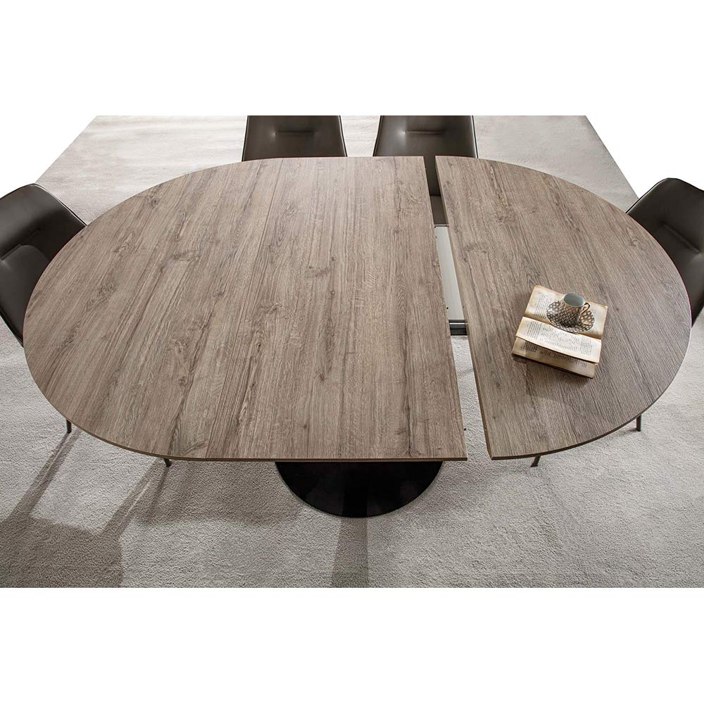 Tavolinë e mrekullueshme ngrënieje me majë të rrumbullakët në dru të laminuar (h 30 mm), me teksturë lisi me buzë të ndezurane mdf dhe bazament ne çelik te lyer me te zeze . Ajo që e bën këtë tavolinë unike dhe veçanërisht funksionale është mundësia e zgjatjes së pjesës së sipërme falë një zgjatimi të jashtëm prej 50 cm, duke përftuar kështu një gjatësi maksimale prej 170 cm dhe duke e lejuar atë të akomodojë deri në 8 persona duke siguruar një tavolinë të vogël. që mund të optimizojë hapësirat e shtëpisë tuaj pasi të mbyllet. Eleganca dhe funksionaliteti janë fjalët kyçe që përshkruajnë më së miri këtë pjesë moderne të mobiljeve që mishëron një pamje jashtëzakonisht bashkëkohore të aftë për të pasuruar estetikën e dhomës duke kompletuar mobiljet me maturi.
