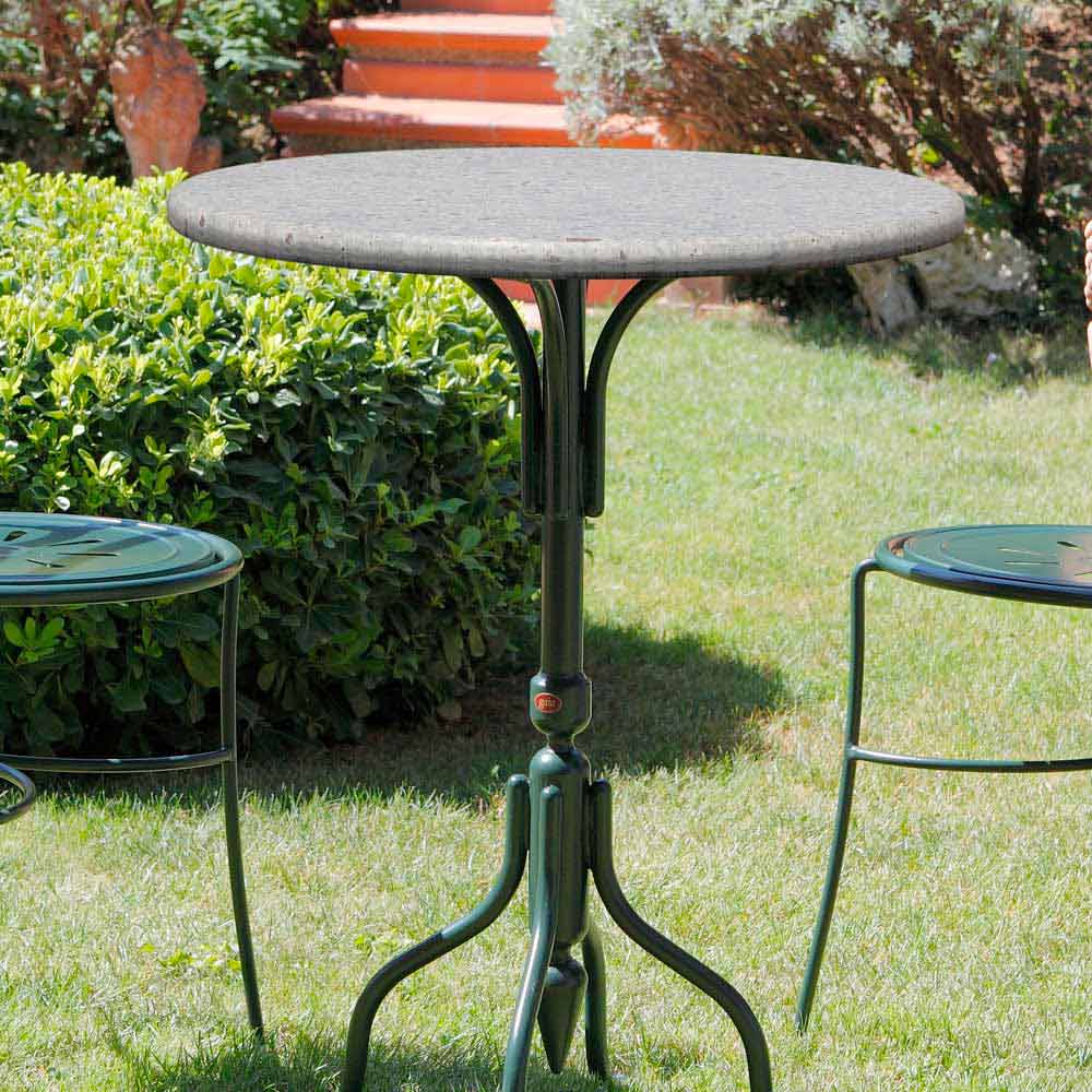 Tavolinë kafeje në natyrë e punuar me dorë në Itali me majë guri të rrumbullakët dhe bazë hekuri të pikturuar jeshile. Një aksesor mobilimi për ambiente të jashtme karakterizohet nga tipare klasike që sjellin ndërmend një model të së kaluarës të pasuruar dhe të bërë unik nga fundi i veçantë që mbulon tërë bazën, elementët dallues të tryezës së kafesë. Pjesa e sipërme prej guri, nga ana tjetër, jep një prekje ekskluzive ndërsa ofron një sipërfaqe të fortë dhe rezistente të mbështetjes, si dhe strukturën e cila, në sajë të galvanizimit të nxehtë , garanton rezistencën ndaj ndryshkjes së metalit për dekada dhe rezistencën e shkëlqyeshme ndaj çdo agjenti. gërryes. Mjeshtëria e bërë në Itali gjithashtu na lejon të ofrojmë një produkt me cilësi të lartë që bie në sy falë përdorimit të materialeve ekskluzive , vëmendjes në detaje dhe përfundimeve të imëta. Ajo që lind është pra një produkt funksional , i qëndrueshëm dhe me cilësi të lartë.