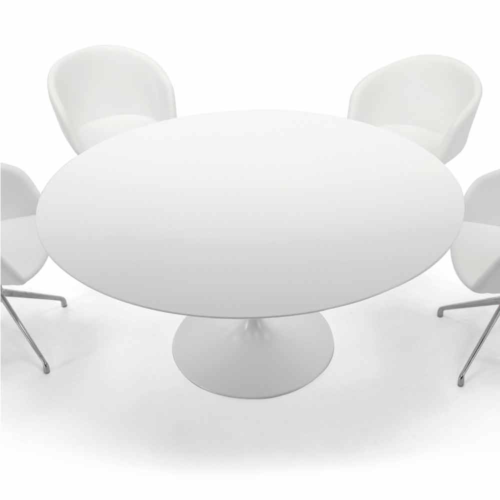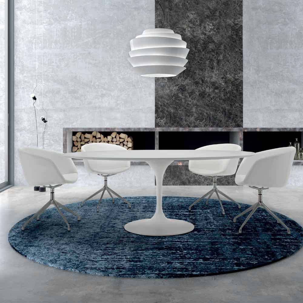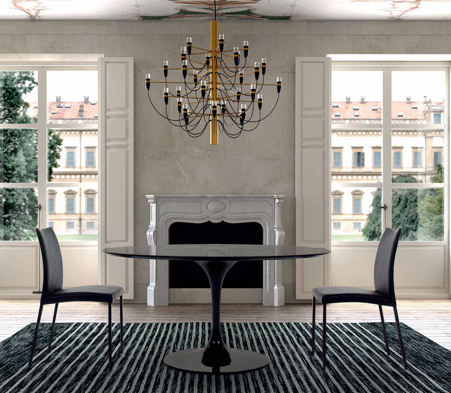 Tryeza moderne e rrumbullakët Dollars shpreh një personalitet të fortë dhe është perfekte për arredime me referenca të ndryshme stilistike. E punuar me dorë në Itali me materiale cilësore të shkëlqyera dhe 100% e prodhuar në Itali. Karakterizohet nga një majë laminate e lëngshme e lyer(trashësia 25 mm)dhe një bazë prej alumini të derdhur e llakuar në të bardhë me shkëlqim ose të zezë me shkëlqim.