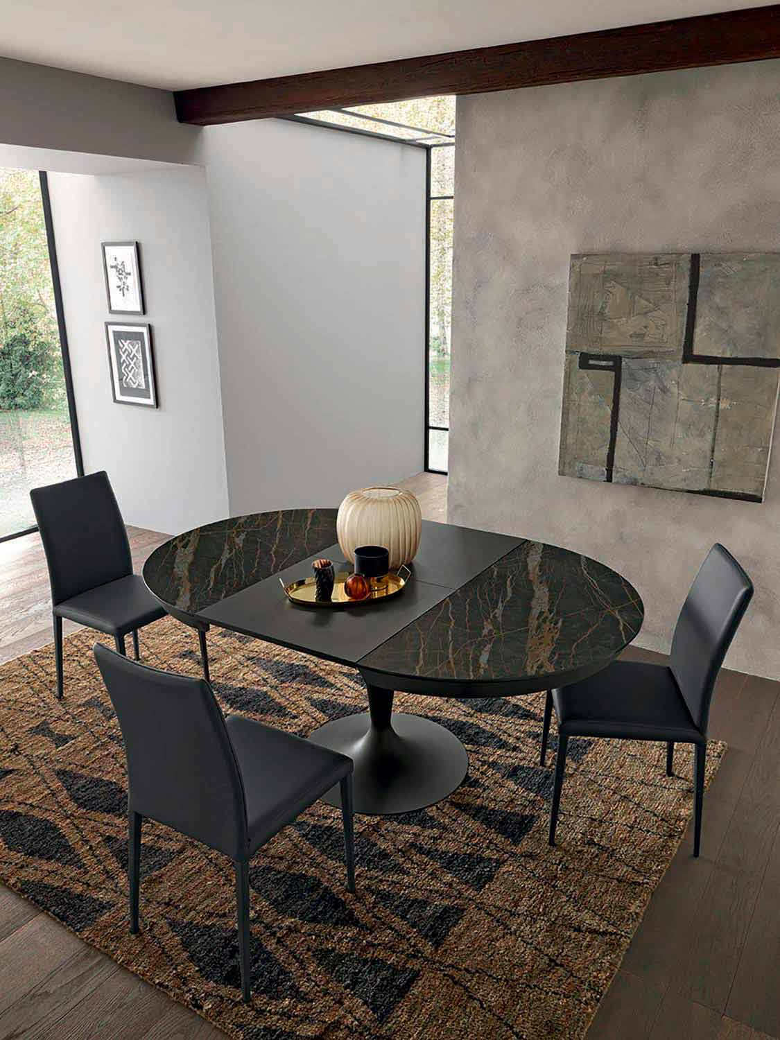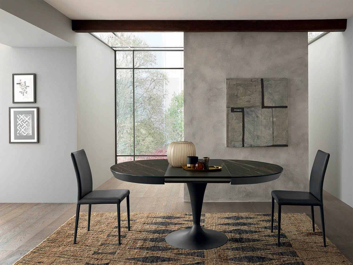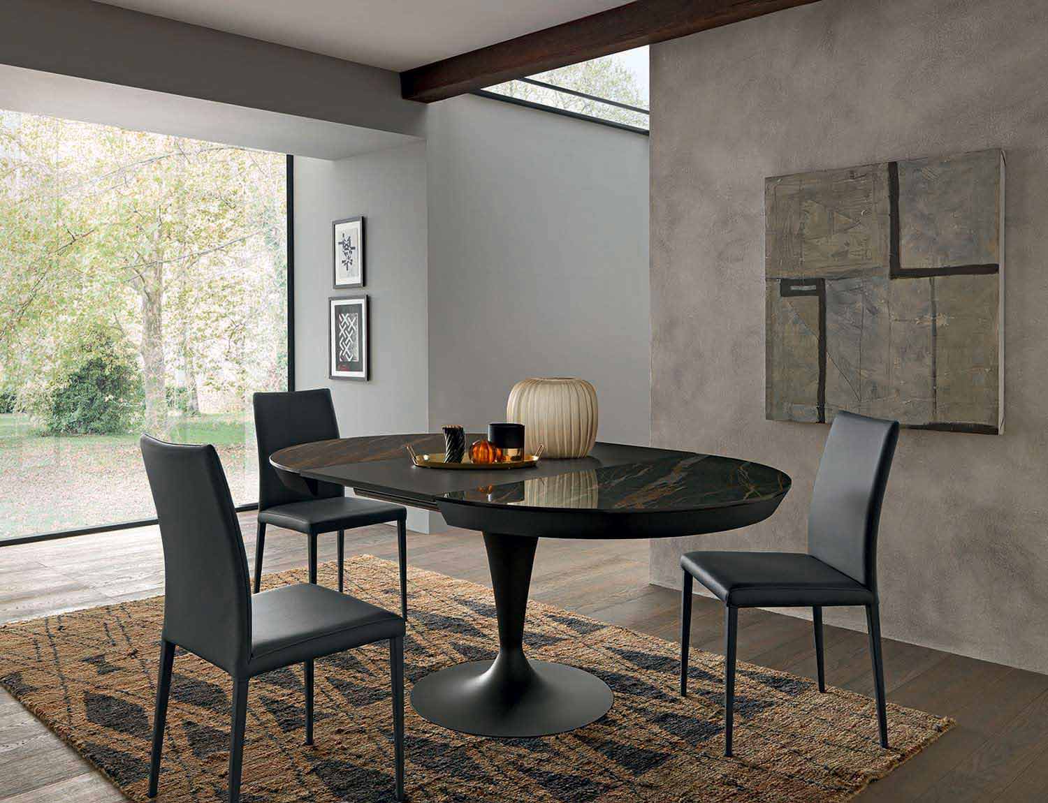 Tavolinë ngrënieje me dizajn të zgjatur me majë qeramike të rrumbullakët laminam dhe bazë metalike Prodhuar në Itali.