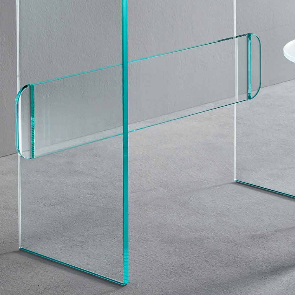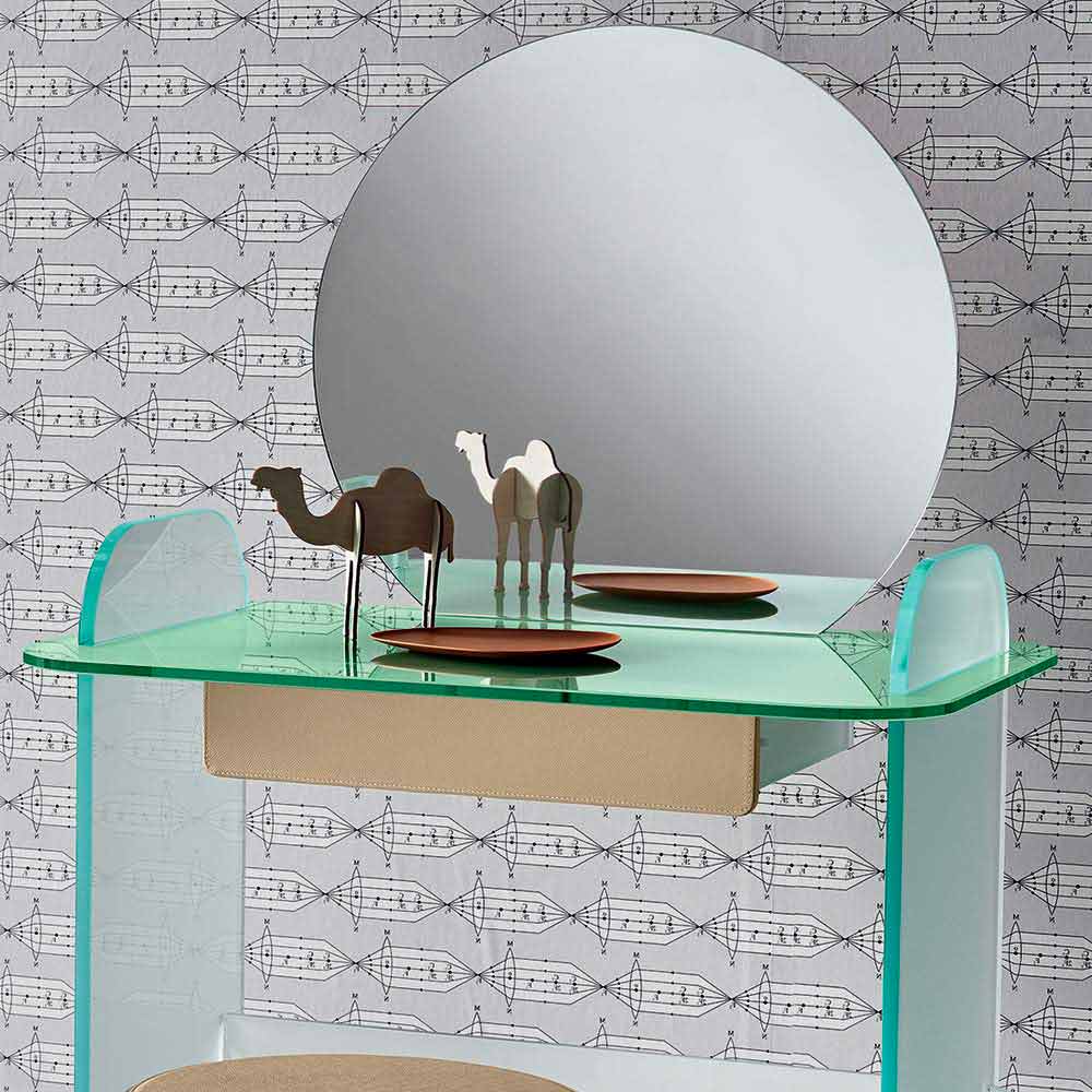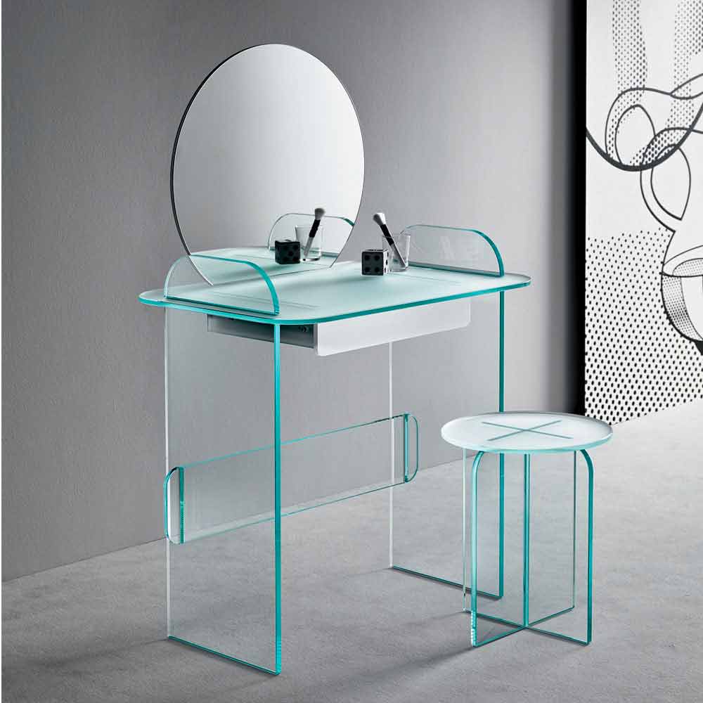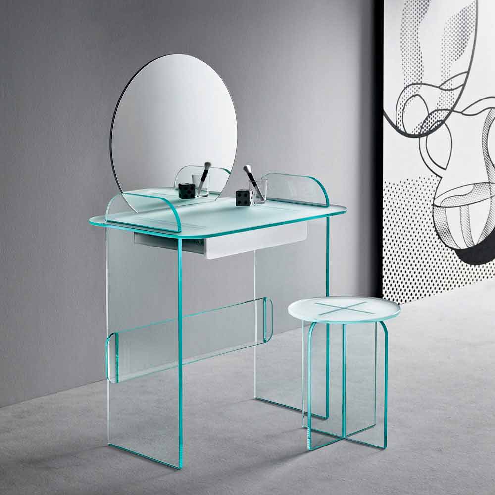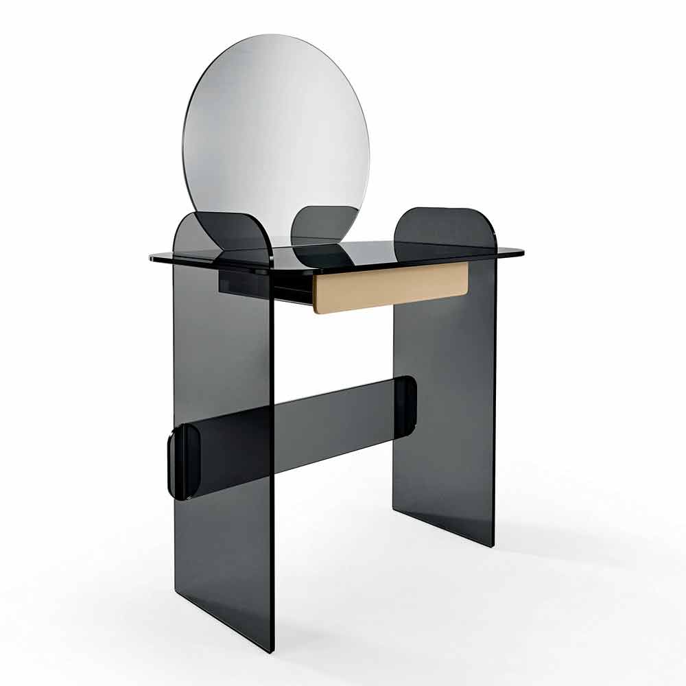Simbol i feminitetit dhe përsosjes, kjo tryezë salcë ka një strukturë tërësisht prej xhami të disponueshme në tre përfundime dhe një sirtar tërheqës të disponueshëm në dru të bardhë mat ose të mbuluar me lëkurë bezhë.