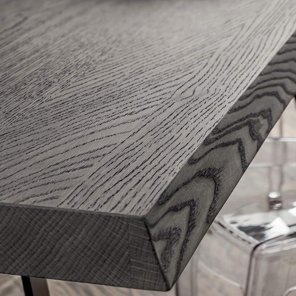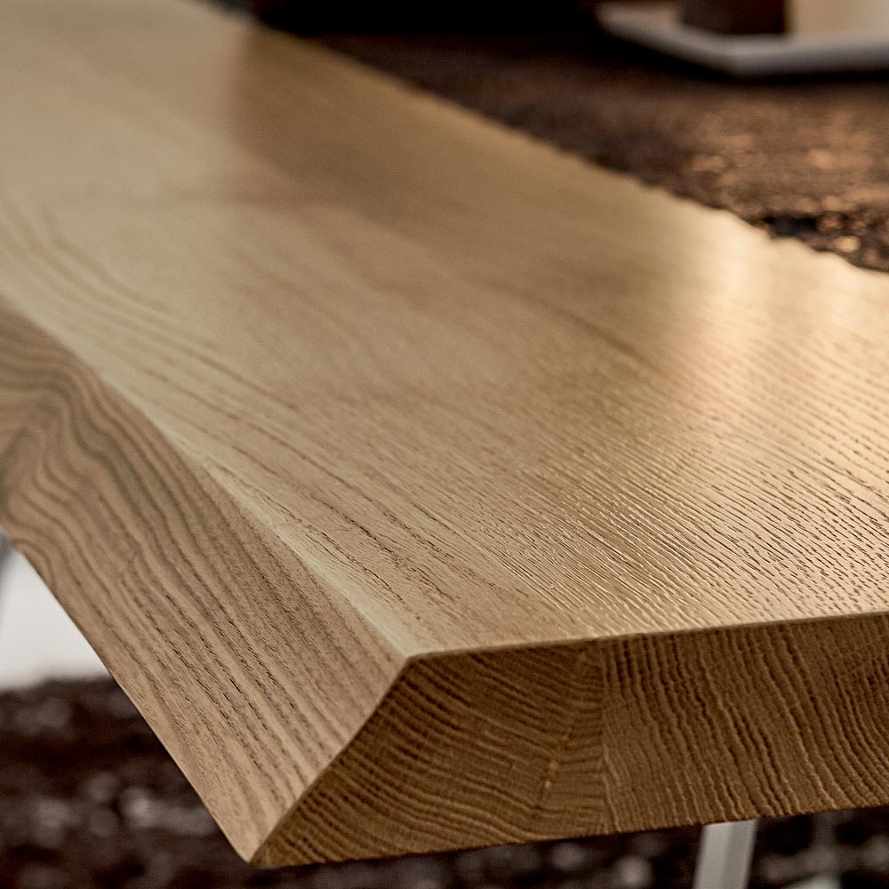 Tavolinë ngrënieje e prodhuar në Itali me këmbë në alumin e llakuar me pluhur epoksidi në fund të antracitit dhe sipër me dru të zhveshur me sipërfaqe të rimeso lisi ose arre. Estetika imponuese e drurit lidhet me prekjen moderne të aluminit duke krijuar një zgjidhje ideale mobilimi për dhomat e ngrënies apo kuzhinat me një stil bashkëkohor që kërkojnë një komplement të aftë për të pushtuar qendrën e vëmendjes duke u bërë protagonist i vërtetë brenda dhomës. Këmbët i japin tryezës një dizajn të hollë dhe mbështesin pjesën e sipërme në një mënyrë të fortë dhe të sigurt, duke ofruar kështu një produkt përfundimtar solid dhe rezistent falë edhe përdorimit të lëndëve të para me cilësi të lartë dhe mjeshtërisë 100% Made in Italy që i jep prestigj dhe vlerë tavolina.