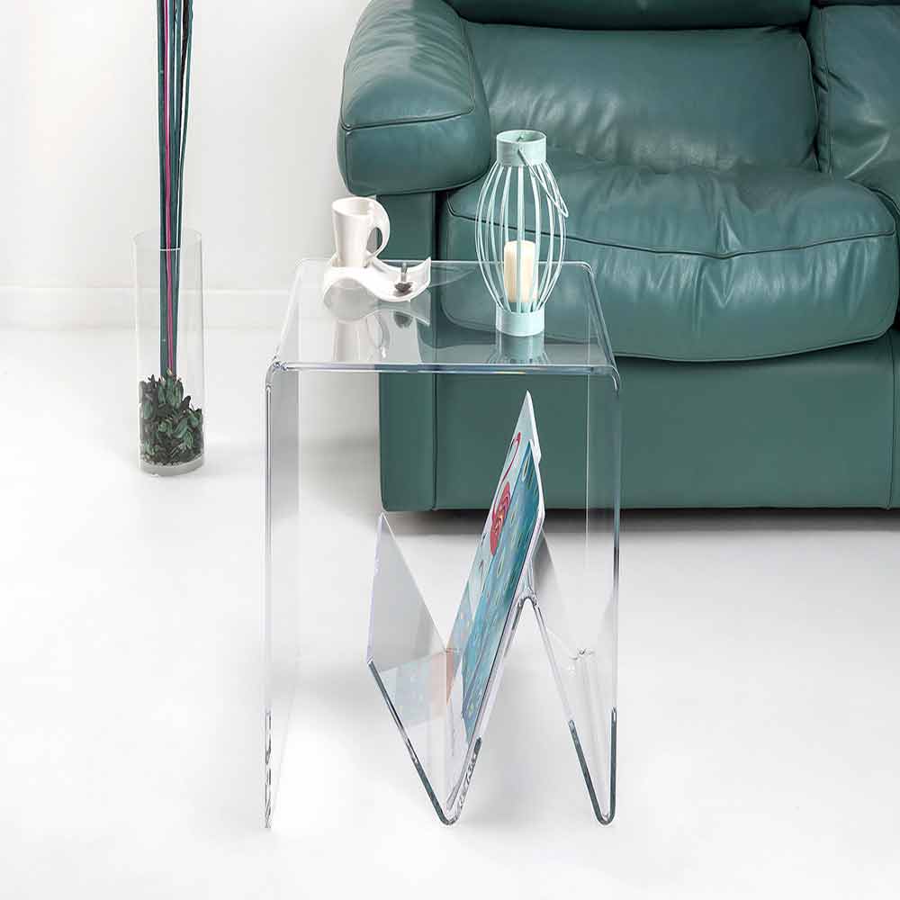 Tavolinë e vogël / raft revistash në pleksiglas, Cavour Tabela e vogël CAVOUR ka një dizajn praktik dhe të matur, i cili mund të përdoret si për shtratin ashtu edhe si tavolinë kafeje, gjithashtu në natyrë. Isshtë bërë me kristal akrilik PMMA 100% nga polimer i virgjër dhe ka një funksion të dyfishtë: është një tavolinë e vogël jashtëzakonisht e dobishme dhe një raft praktik për revista. Karakteristikat fiziko-teknike të pleksiglas (rezistente nga goditja, jo deformuese, e pandryshueshme, izoluese termike) e bëjnë tryezën e vogël të përshtatshme si për hapësirat e brendshme ashtu edhe ato të jashtme. Shkëlqimi dhe shkëlqimi i saj ruhen të pandryshuar dhe të pandryshuar me kalimin e kohës. Plexiglasi PMMA i përdorur nga polimeri i virgjër në jooksik, hipoallergjik, pa erë dhe antibakterial. 100% e riciklueshme. Mendim, projektuar dhe bërë në Itali me materiale italiane.