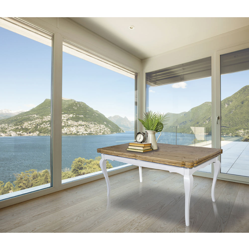 Tavolinë e zgjatur e dhomës së ndenjes në bredh nordik të lidhur me qoshe në formë . Këmbët janë kthyer në dru të ngurtë dhe lidhen me njëra-tjetrën me një brez prej druri të fortë . Produkti është bërë tërësisht në Toskanë me përdorimin e materialeve të cilësisë së lartë dhe vjen me 2zgjatime prej 50 cm secila që e bëjnë atë të gjithanshëm .
