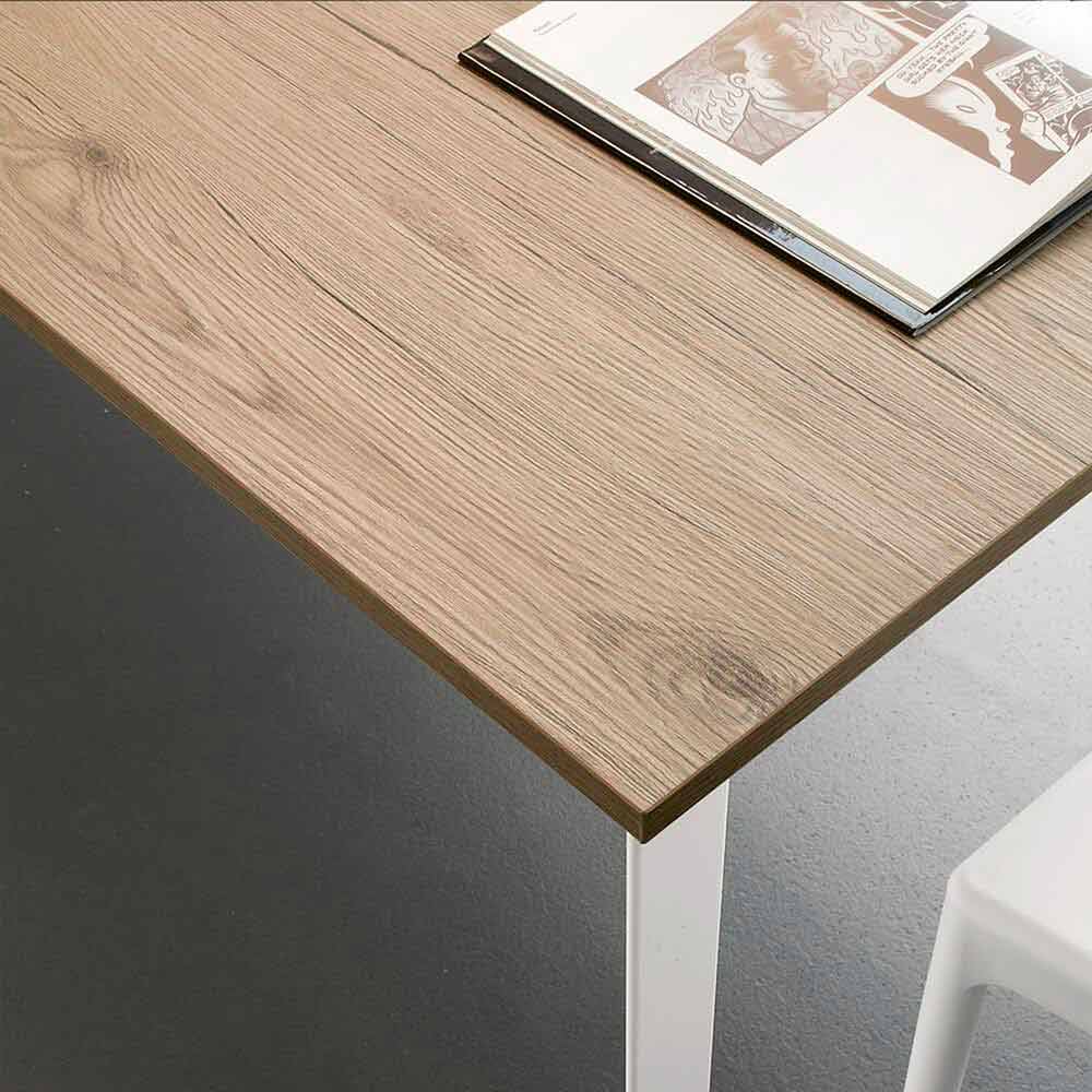 Tavolina për darkë e prodhuar në Itali me majë melamine (trashësi 20 mm) me fund lëvore, shtrirje në melaminë që përputhet me majën dhe bazën në metal të bardhë të lyer