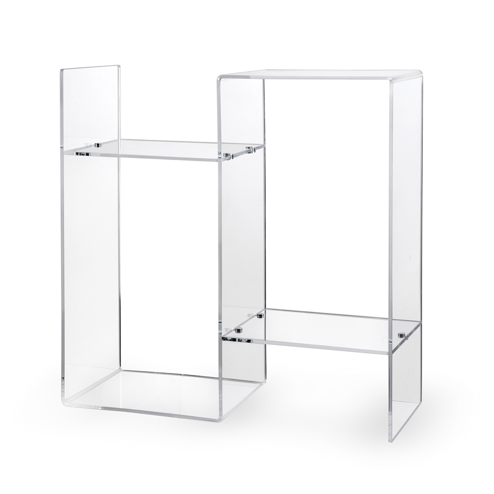 Tavolinë kafeje për anën e divanit e prodhuar tërësisht në Itali nëpërmjet përdorimit të pleksiglasit , një material inovativ ideal për prodhimin e aksesorëve të arredimit pasi është jo toksik, hipoallergjik, pa erë, antibakterial dhe 100% i riciklueshëm. Dizajni i tij diskret dhe linear ka një raft të dyfishtë për funksionalitet më të madh dhe nxjerr në pah shkëlqimin dhe shkëlqimin e tij, të cilat mbeten konstante dhe të pandryshuara me kalimin e kohës.