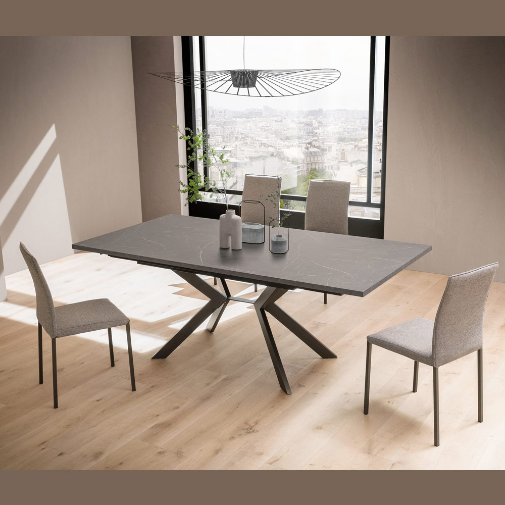 Baza, prej metali të lyer dhe me një dizajn gjeometrik të kryqëzuar, ofron stabilitet dhe një prekje skulpturale që nuk kalon pa u vënë re. Një zgjidhje perfekte mobilimi për dhoma ngrënieje, hapësira të hapura ose ambiente të ngushta me një stil të rafinuar.