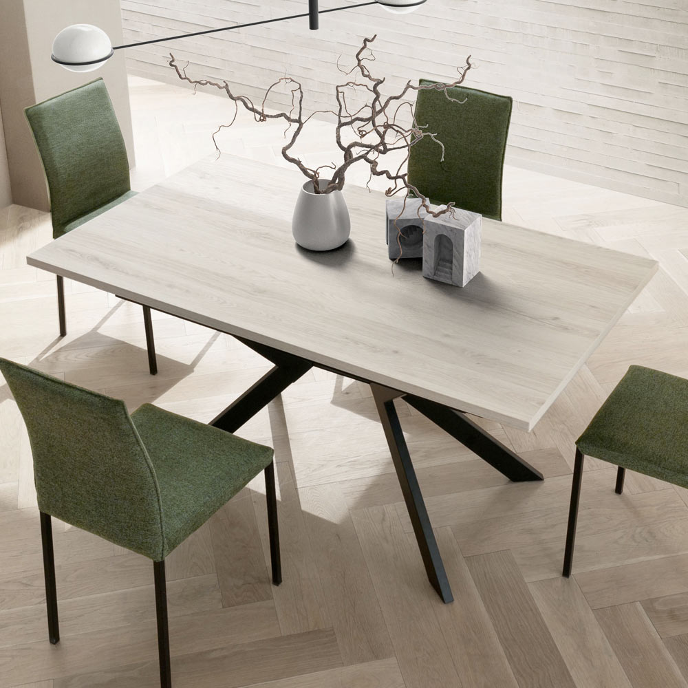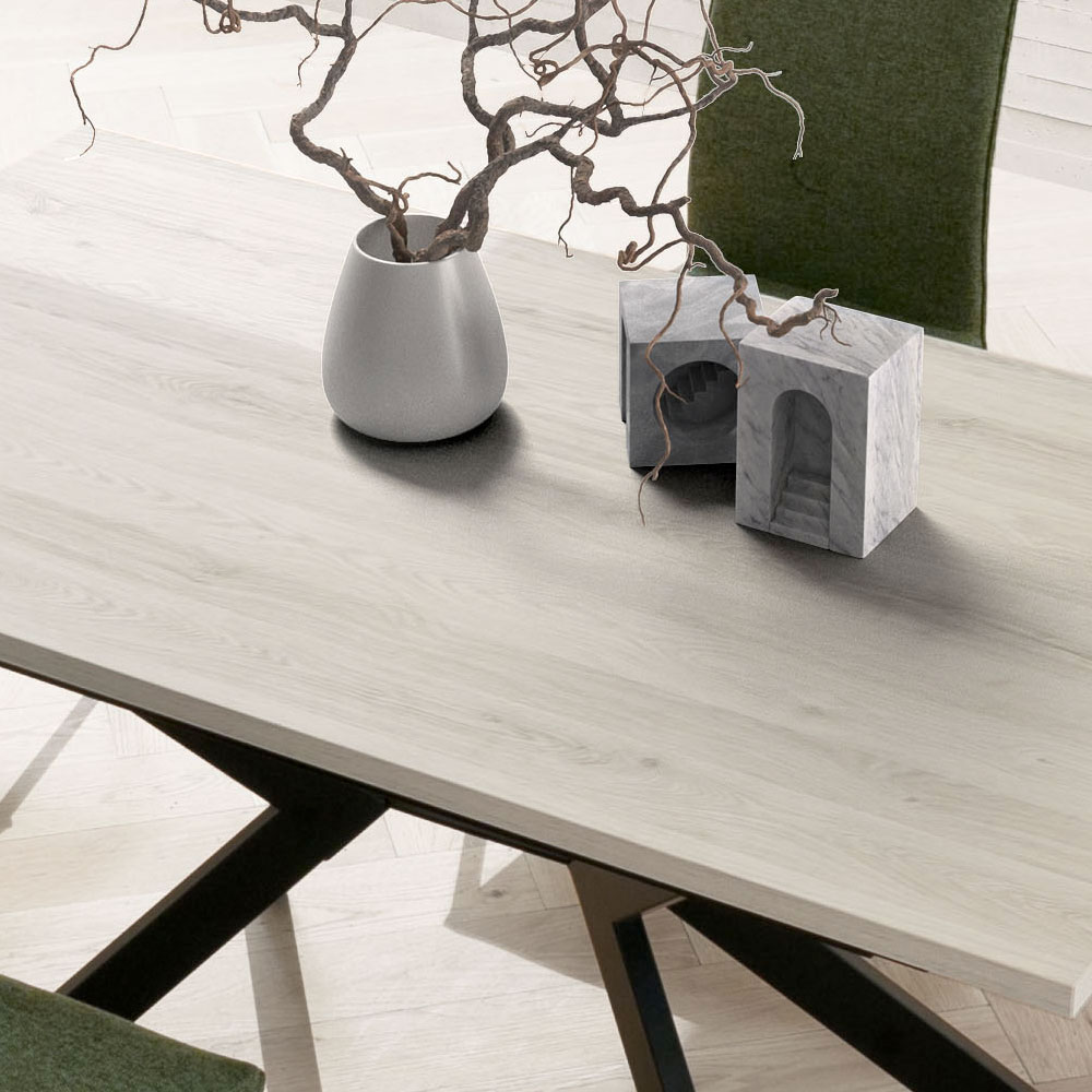 Baza, prej metali të lyer dhe me një dizajn gjeometrik të kryqëzuar, ofron stabilitet dhe një prekje skulpturale që nuk kalon pa u vënë re. Një zgjidhje perfekte mobilimi për dhoma ngrënieje, hapësira të hapura ose ambiente të ngushta me një stil të rafinuar.