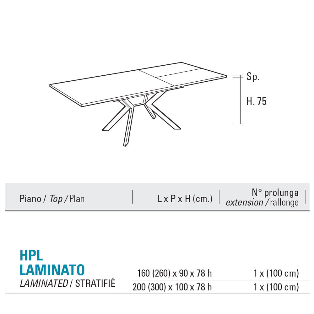 Sipërfaqja drejtkëndëshe HPL ofron një pamje të rafinuar dhe materiale, perfekte për mjedise moderne. Sipërfaqja është rezistente , ideale për përdorim të përditshëm pa sakrifikuar estetikën. Sistemi i integruar i zgjatjes ju lejon të zgjasni lehtësisht tavolinën, duke e bërë atë perfekte për të mirëpritur miqtë dhe familjen në çdo rast.