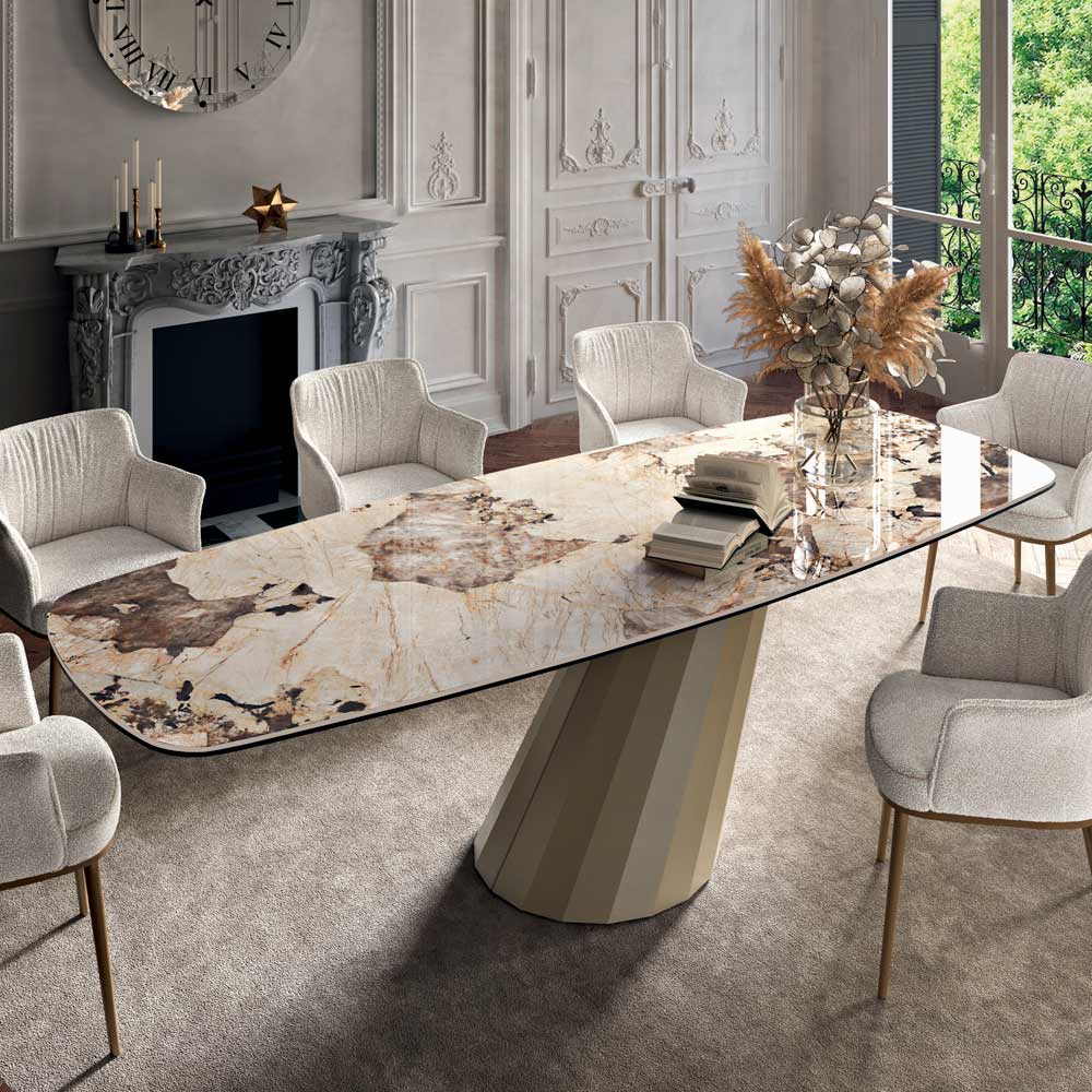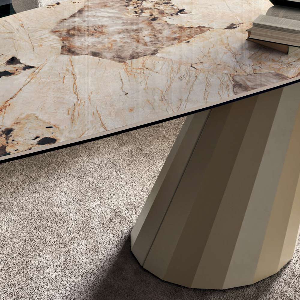 Tavolinë fikse e dhomës së ndenjes në formë fuçie me majë qeramike , buzë të pjerrëta 45° , bazë çeliku të lakuar me shampanjë dhe këmbë të rregullueshme Prodhuar në Itali. Ky produkt çliron një elegancë të madhe dhe bëhet protagonist i çdo ambienti . Përsosja e formës së bazës së kombinuar me përfundimin e pjesës së sipërme që zgjidhni krijon një tavolinë unike, me një ndikim të madh vizual që mobilon me shije dhe rafinim ambientet e përditshme dhe të kontraktuara. Zgjedhja e materialeve me cilësi të lartë dhe vëmendja në krijimin e çdo detaji krijon një produkt me cilësi të shkëlqyer Made in Italy.