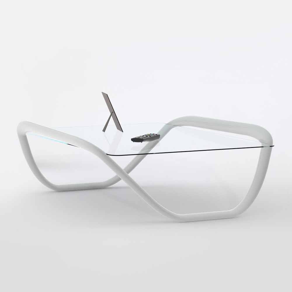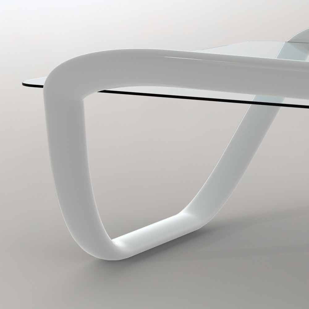 Tavolinë kafeje me strukturë Solid Surface; për një propozim të karakterizuar nga shenja e thjeshtë dhe sugjestive e një vije të vazhdueshme sinuoze. Një zgjidhje formale thelbësore, e aftë për të personalizuar mjedisin. Transparenca e pjesës së sipërme të xhamit lejon të theksohen linjat e buta të strukturës. Një formë unike në vazhdimësinë e hapësirës. Me një llak të bardhë me shkëlqim / mat (RAL9003).