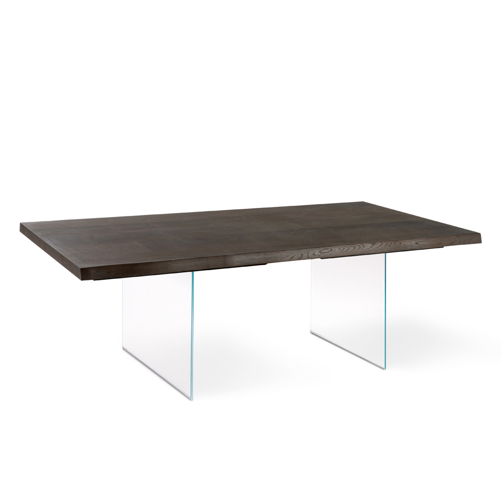 Tavolinë fikse e dhomës së ndenjes me sipërme rimeso lisi , këmbë ekstra transparente prej xhami të temperuar.