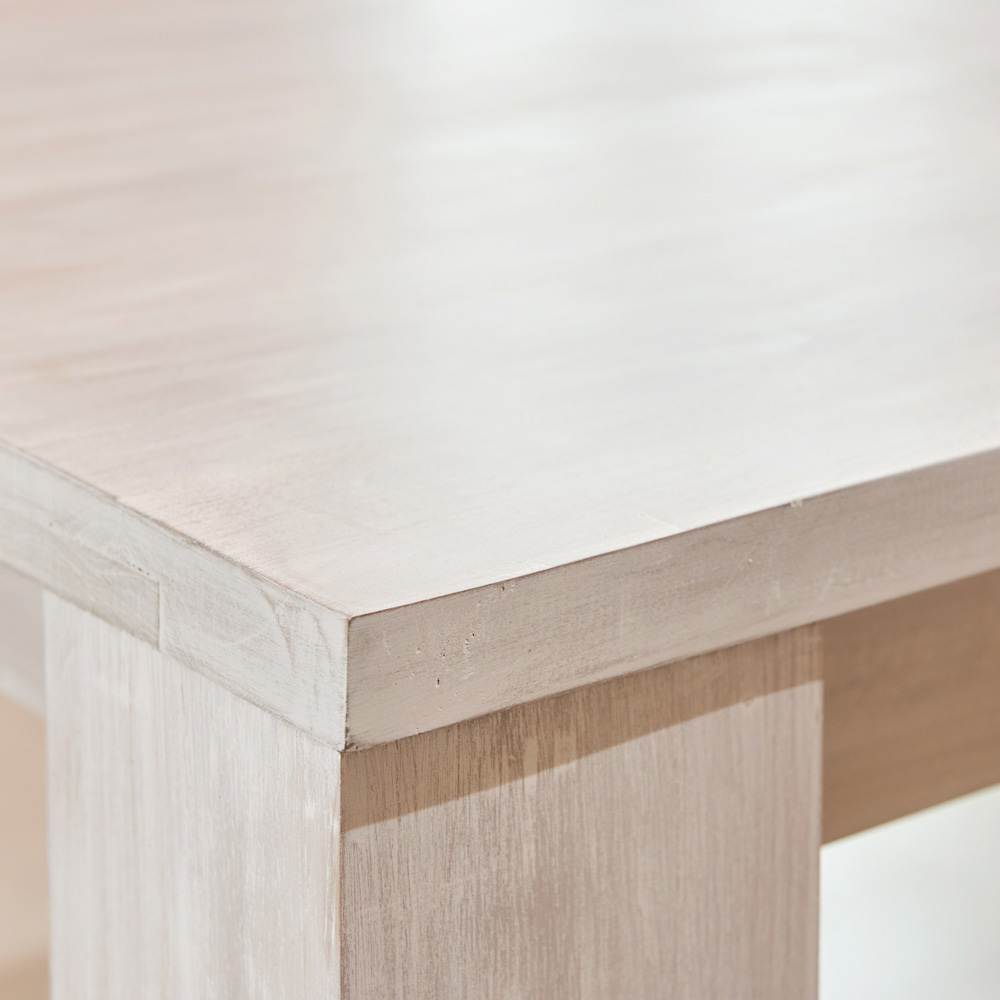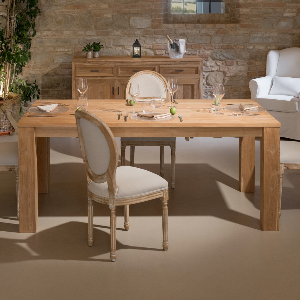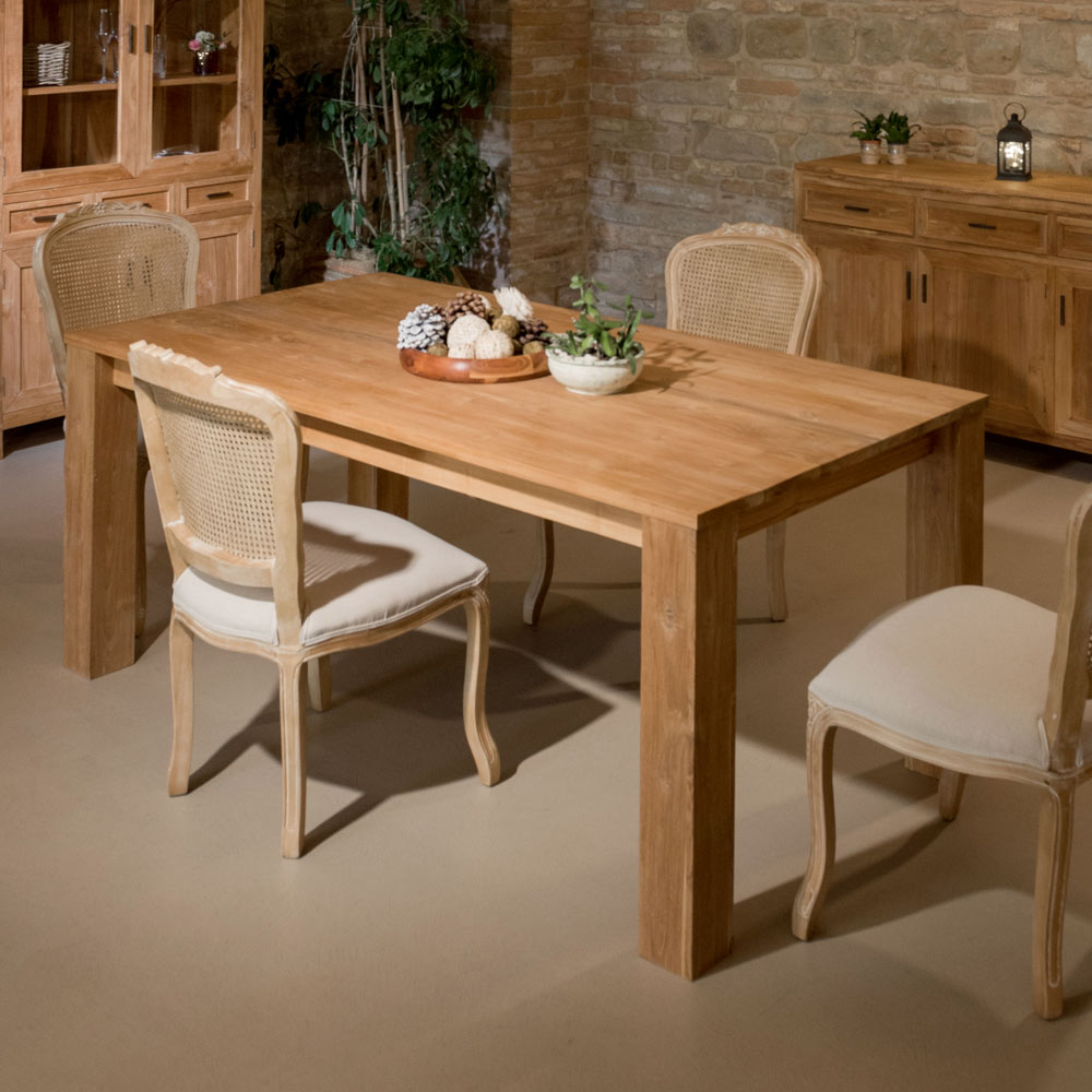 Kjo tavolinë e fiksuar prej druri të fortë tik është një copë e fortë dhe elegante, ideale për t'i shtuar stil dhomës së ngrënies ose kuzhinës tuaj. Struktura dhe mjeshtëria e fortë përmirësojnë fibrat natyrale të drurit , duke krijuar një atmosferë të ngrohtë dhe mikpritëse.